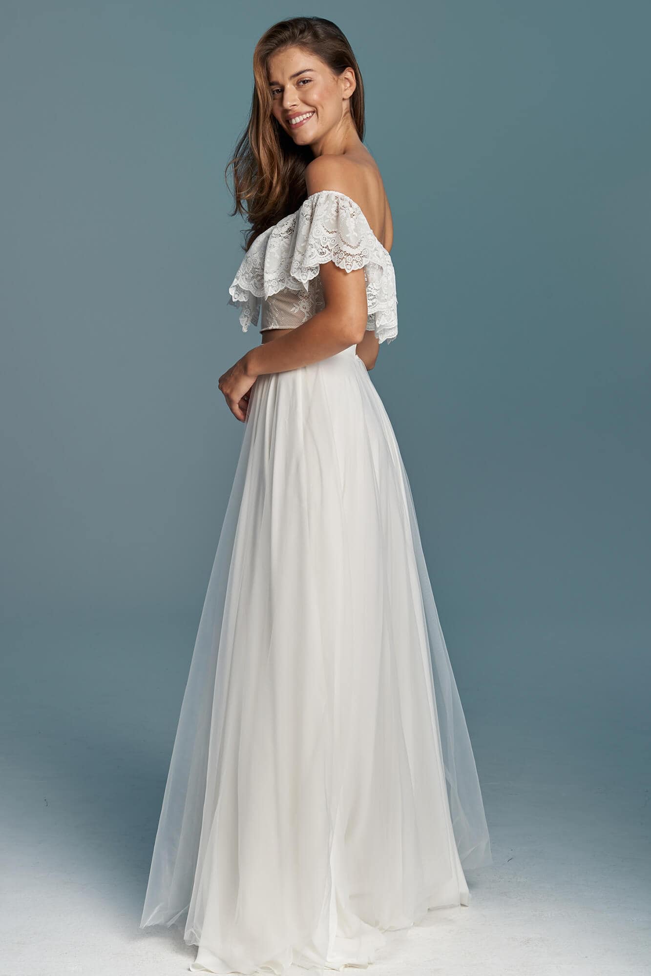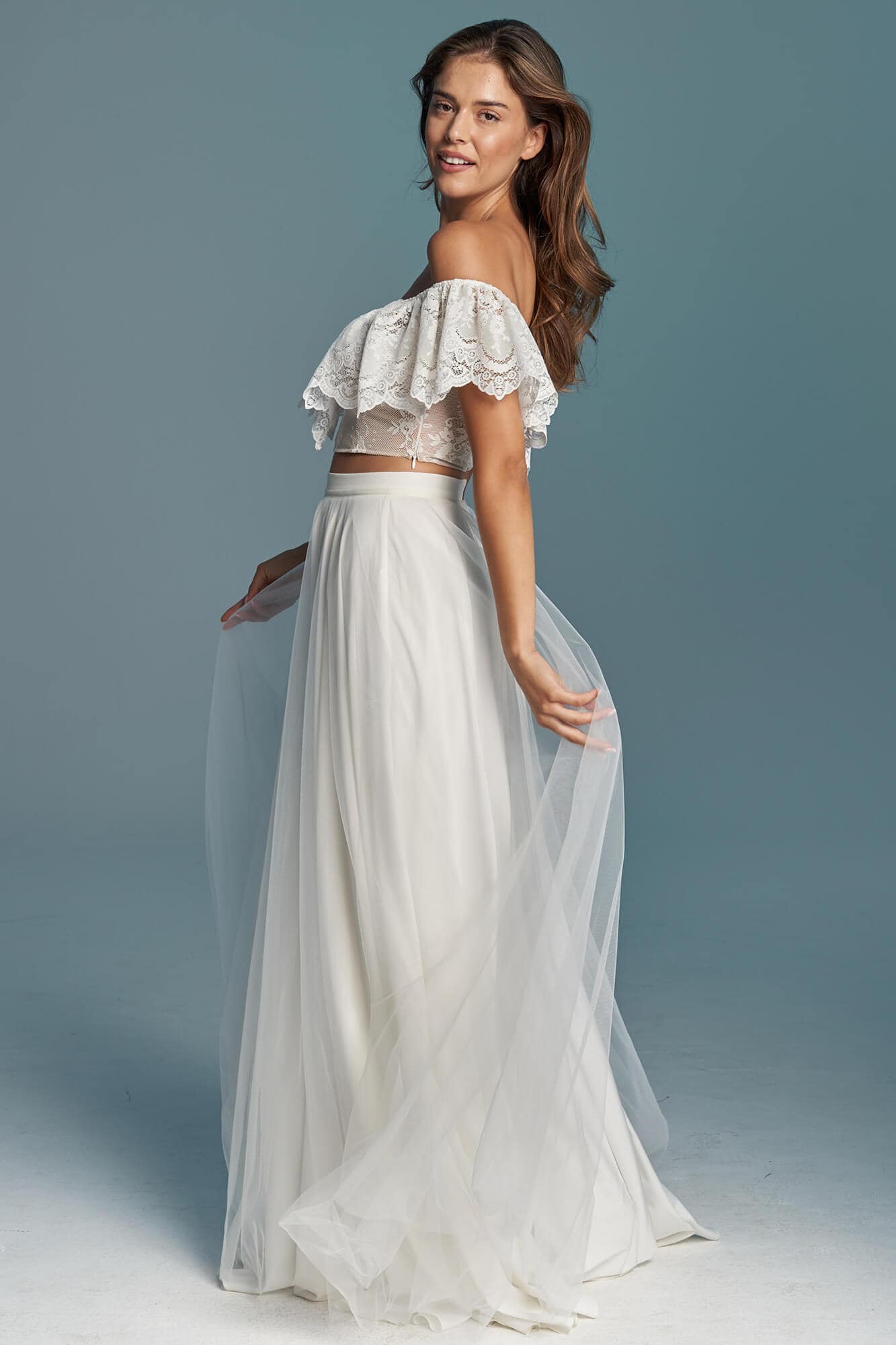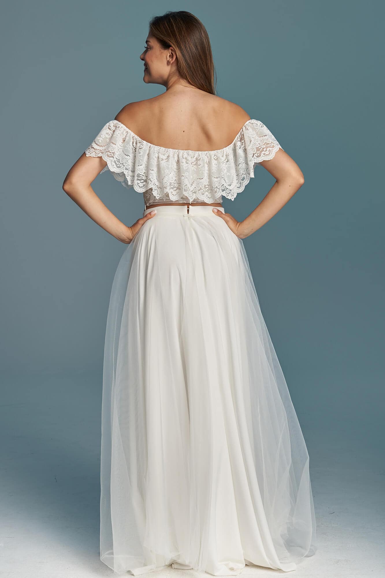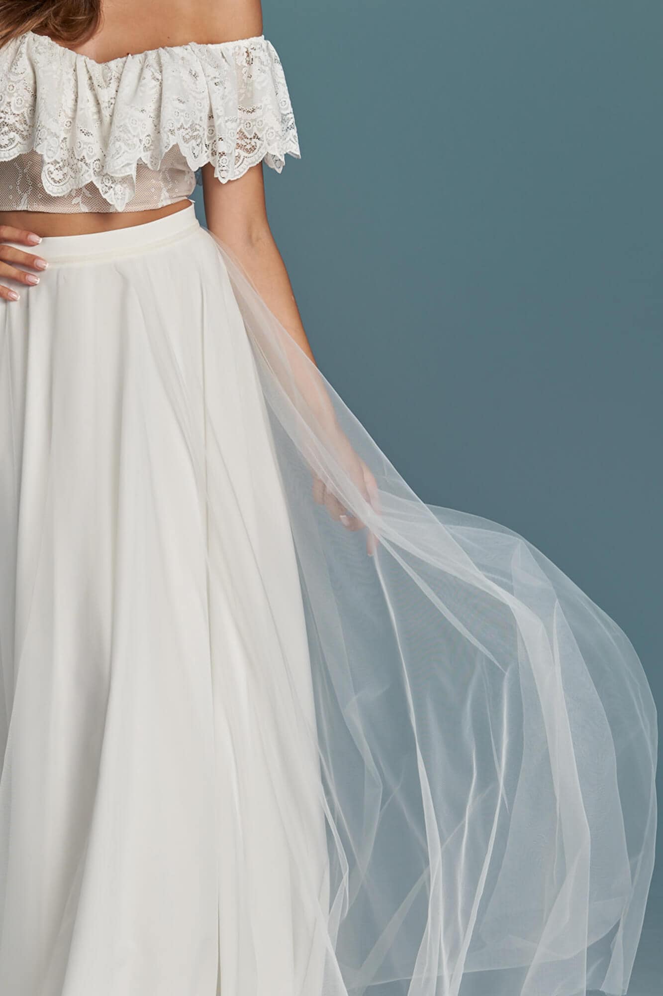 Ta suknia to model wyjściowy - możemy w niej zmienić praktycznie wszystko! Pogłębić lub spłycić dekolt, zmienić jego wykończenie, kształt, dodać lub odjąć falbankę czy frędzle. Rękawy mogą być dłuższe lub krótsze, mieć inny kształt niż te na zdjęciu. Może też nie być ich wcale. Tiul w spódnicy można dodać (lub odjąć) na wierzchu, albo pod spodem. Podszewka może być długa lub krótka w odcieniach bieli i beżu. Rozcięcie na nogę i tren można dodać lub usunąć praktycznie w każdym modelu.