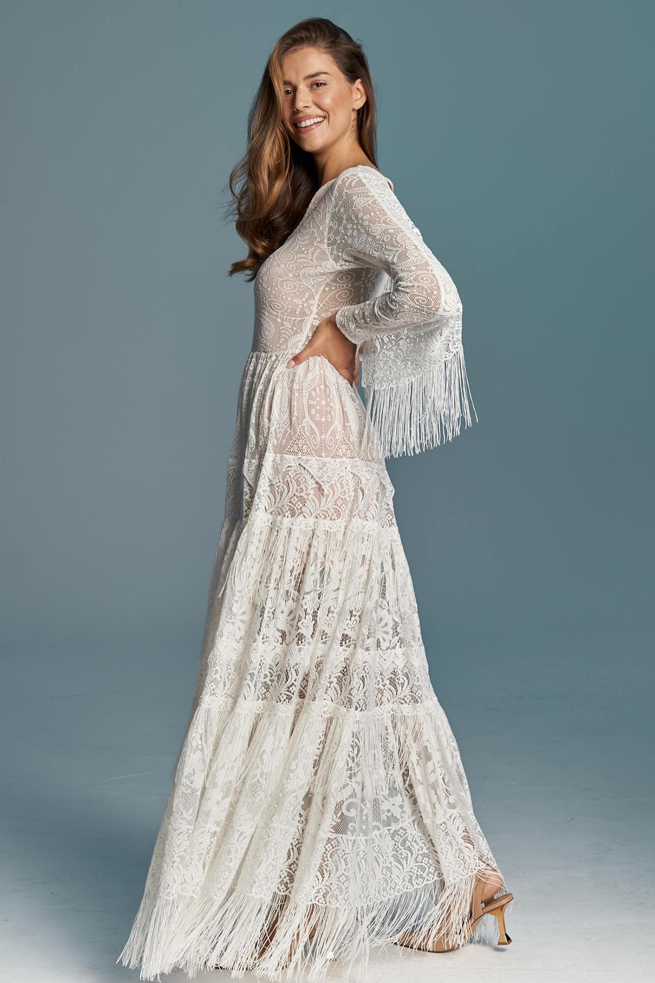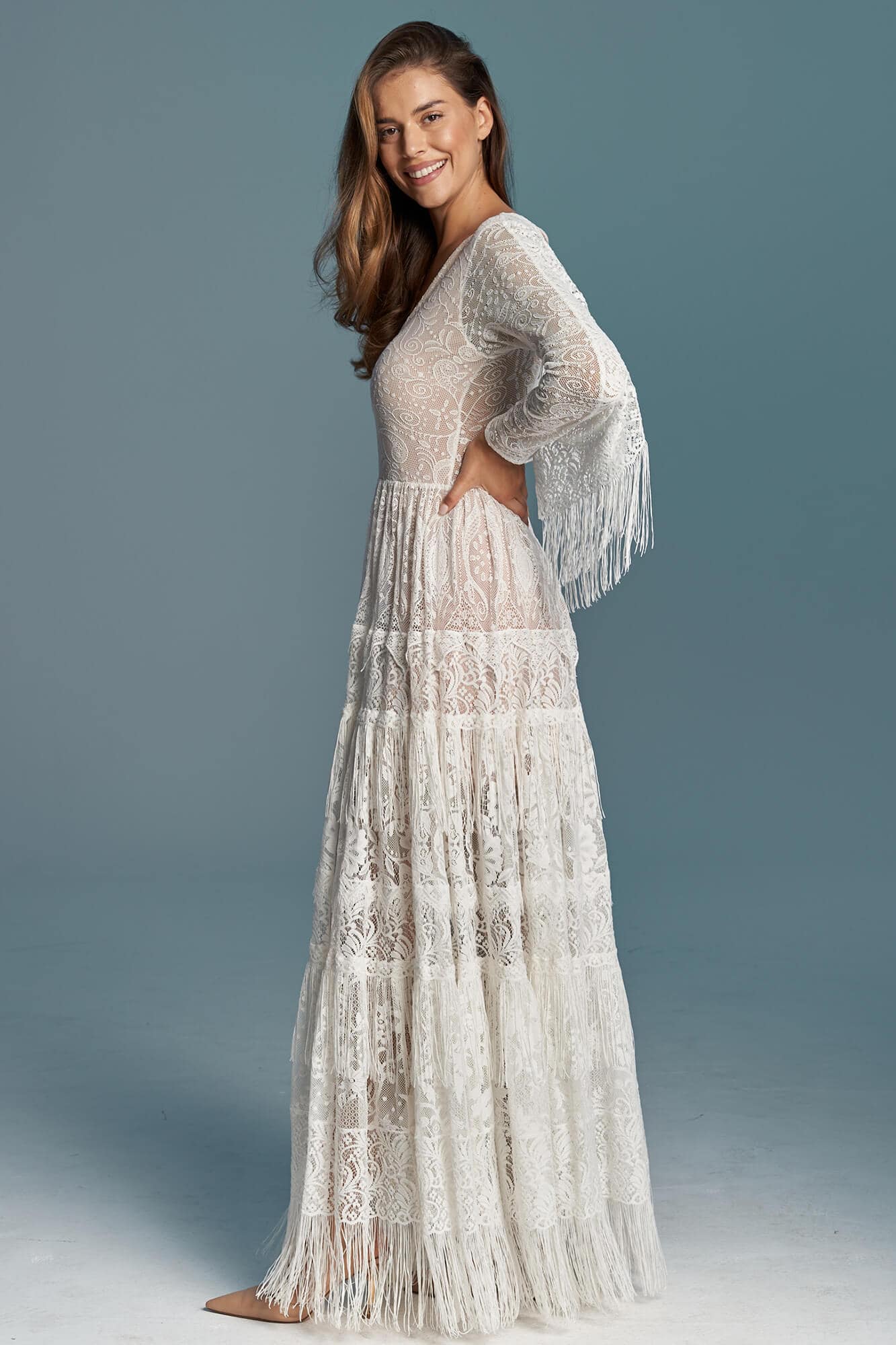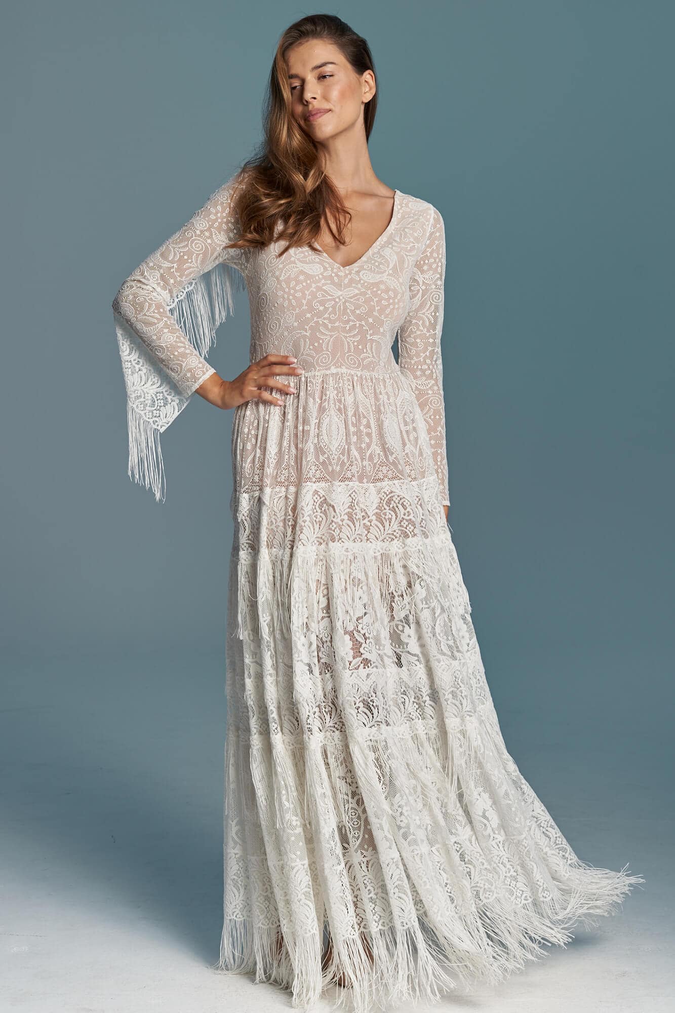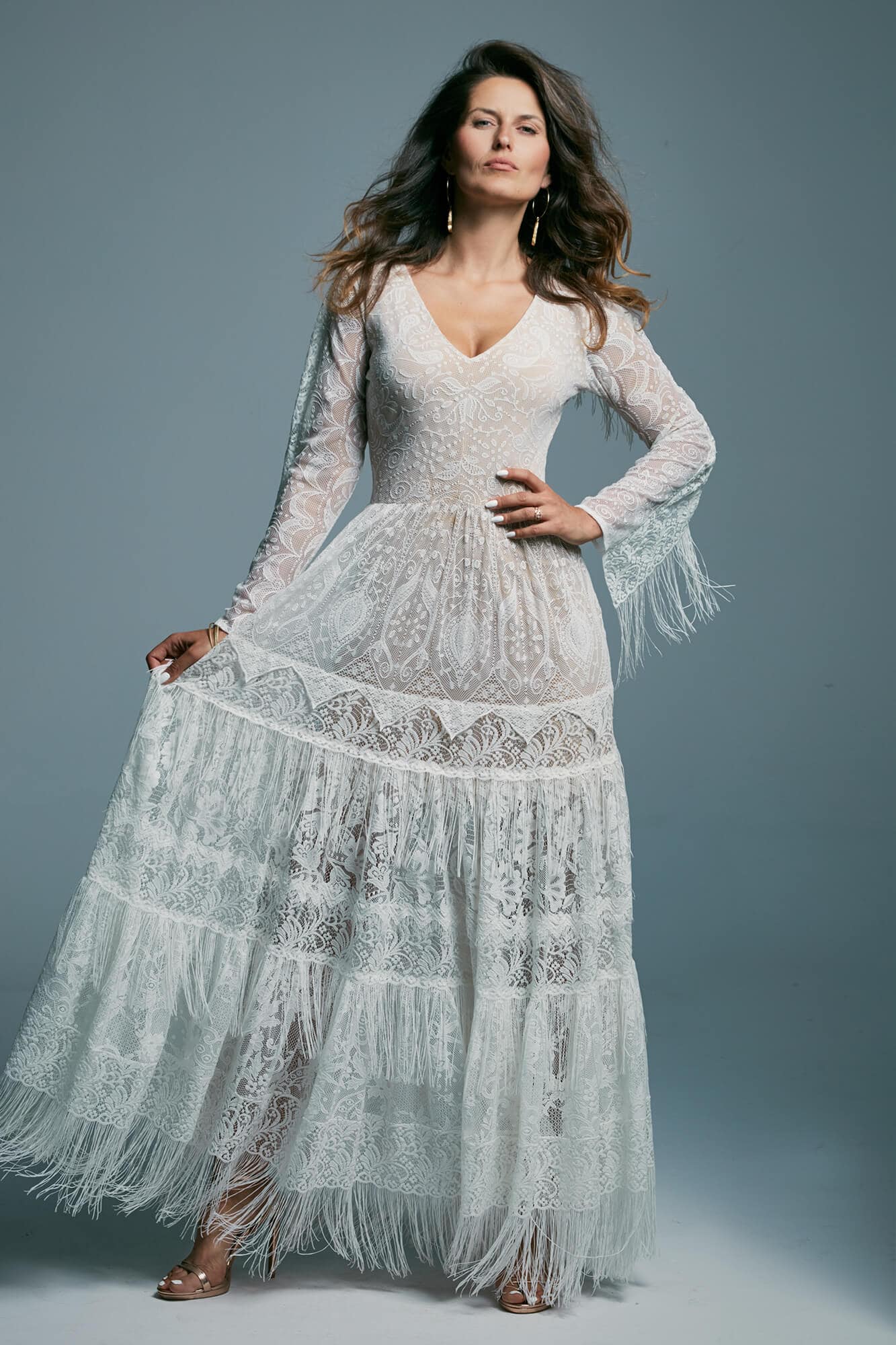 Ta suknia to model wyjściowy - możemy w niej zmienić praktycznie wszystko! Pogłębić lub spłycić dekolt, zmienić jego wykończenie, kształt, dodać lub odjąć falbankę czy frędzle. Rękawy mogą być dłuższe lub krótsze, mieć inny kształt niż te na zdjęciu. Może też nie być ich wcale. Tiul w spódnicy można dodać (lub odjąć) na wierzchu, albo pod spodem. Podszewka może być długa lub krótka w odcieniach bieli i beżu. Rozcięcie na nogę i tren można dodać lub usunąć praktycznie w każdym modelu.