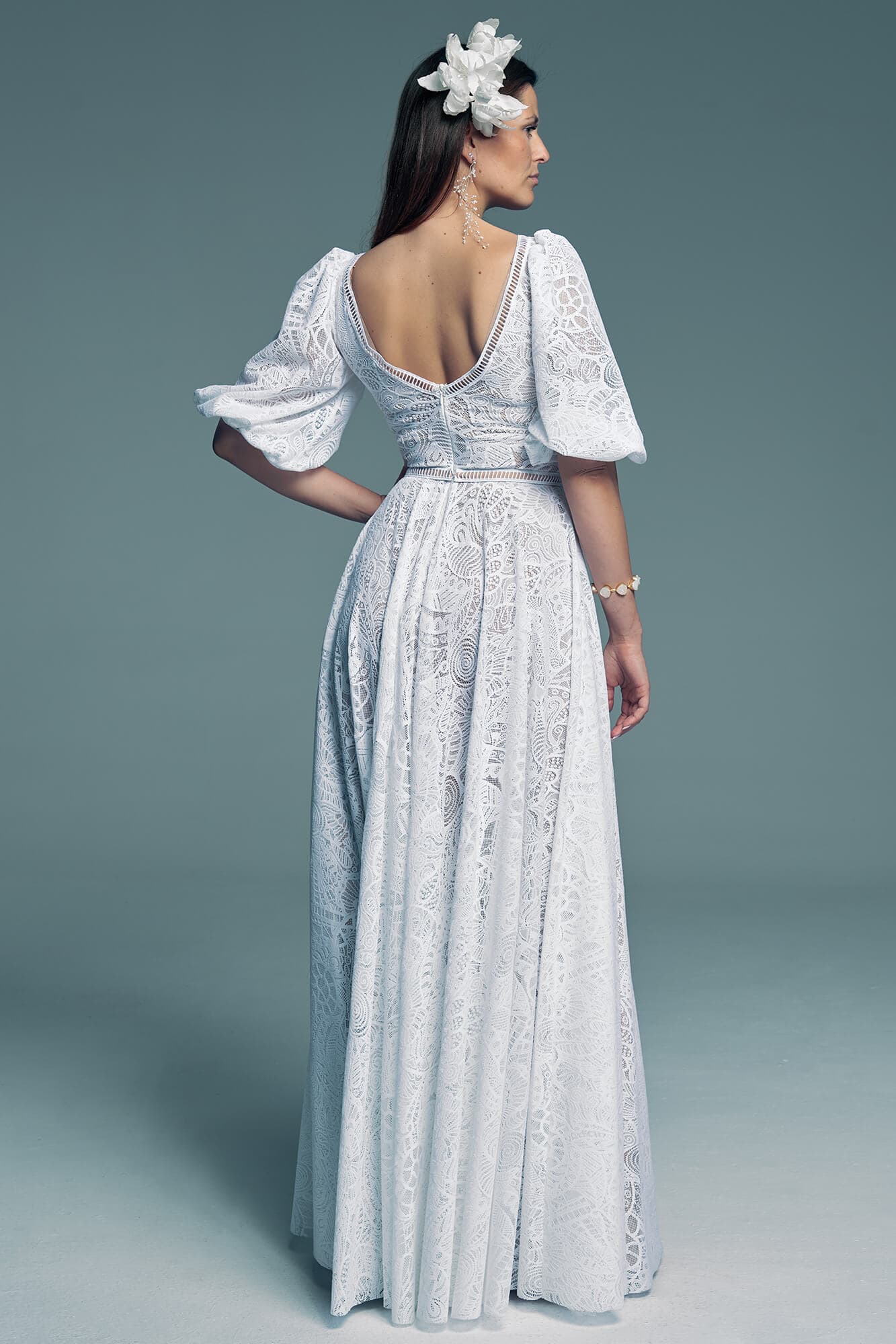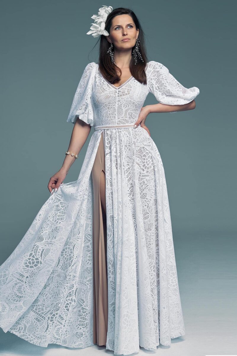 Ta suknia to model wyjściowy - możemy w niej zmienić praktycznie wszystko! Pogłębić lub spłycić dekolt, zmienić jego wykończenie, kształt, dodać lub odjąć falbankę czy frędzle. Rękawy mogą być dłuższe lub krótsze, mieć inny kształt niż te na zdjęciu. Może też nie być ich wcale. Tiul w spódnicy można dodać (lub odjąć) na wierzchu, albo pod spodem. Podszewka może być długa lub krótka w odcieniach bieli i beżu. Rozcięcie na nogę i tren można dodać lub usunąć praktycznie w każdym modelu.