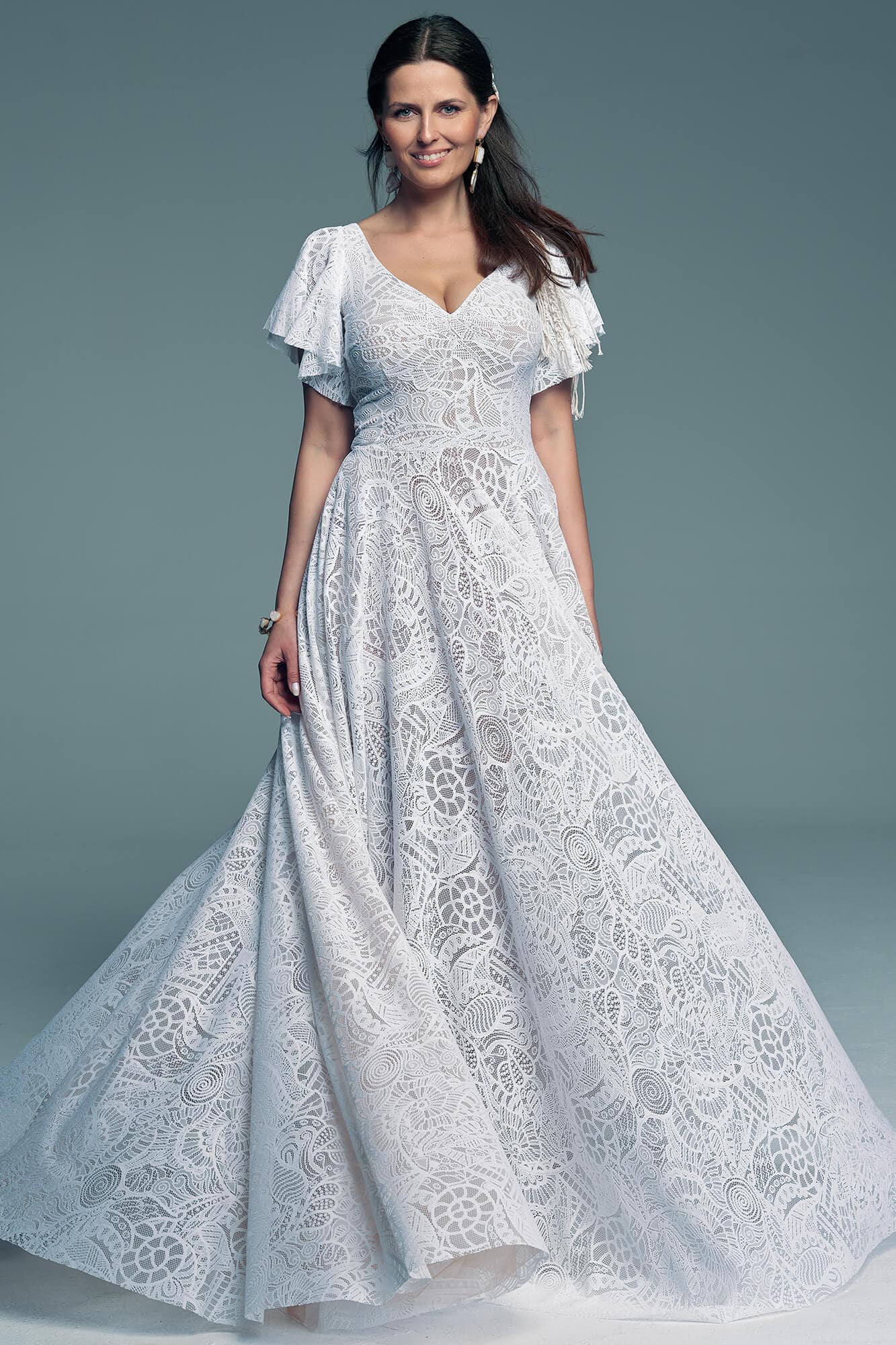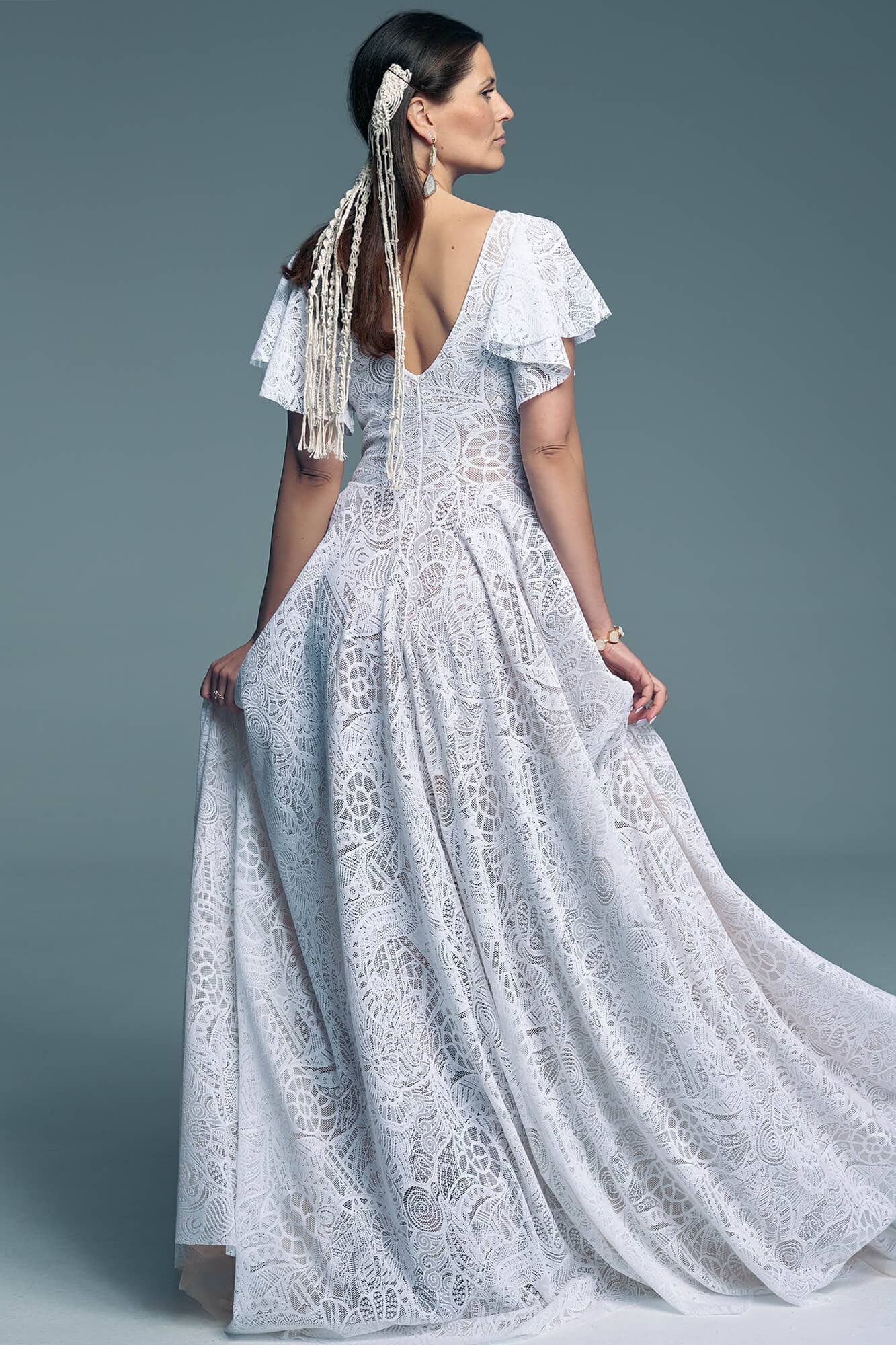 Uszyta ze sprawdzonych i przetestowanych przez nas materiałów. Używane przez nas koronki są mięciutkie, a dzięki swej lekkości cudownie układają się na sylwetce i pięknie wirują w tańcu. Ich elastyczność sprawia, że pracują z Twoim ciałem. Zapewniają komfort rosnącemu ciążowemu brzuszkowi. Praktycznie wszystkie nasze koronki są łatwe do prania w domowej pralce i niegniotące, dzięki czemu swoją suknię spokojnie możesz spakować do walizki i zabrać na romantyczną sesję poślubną.