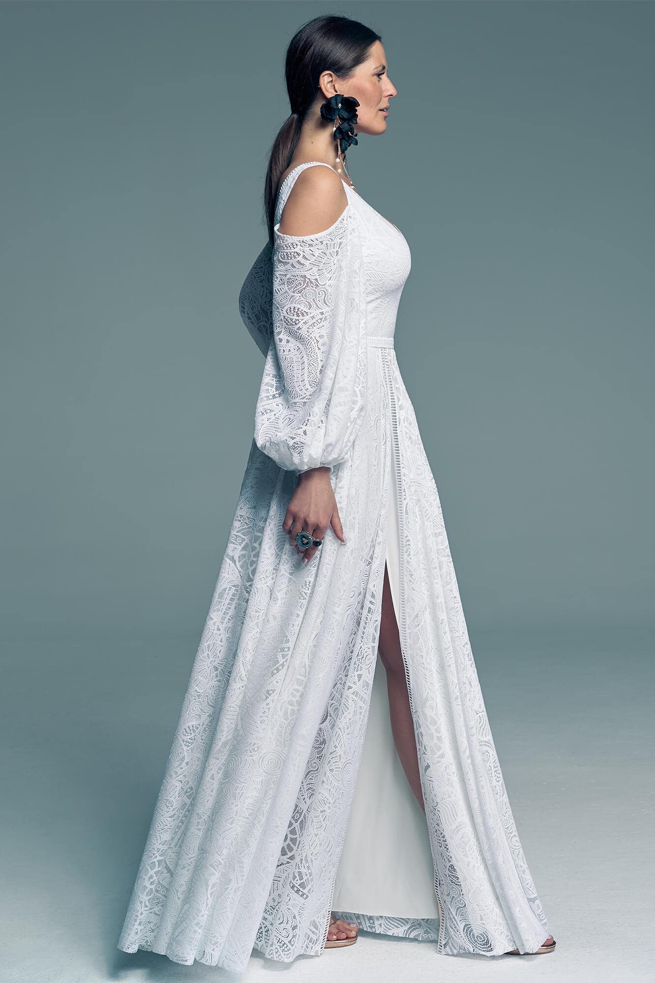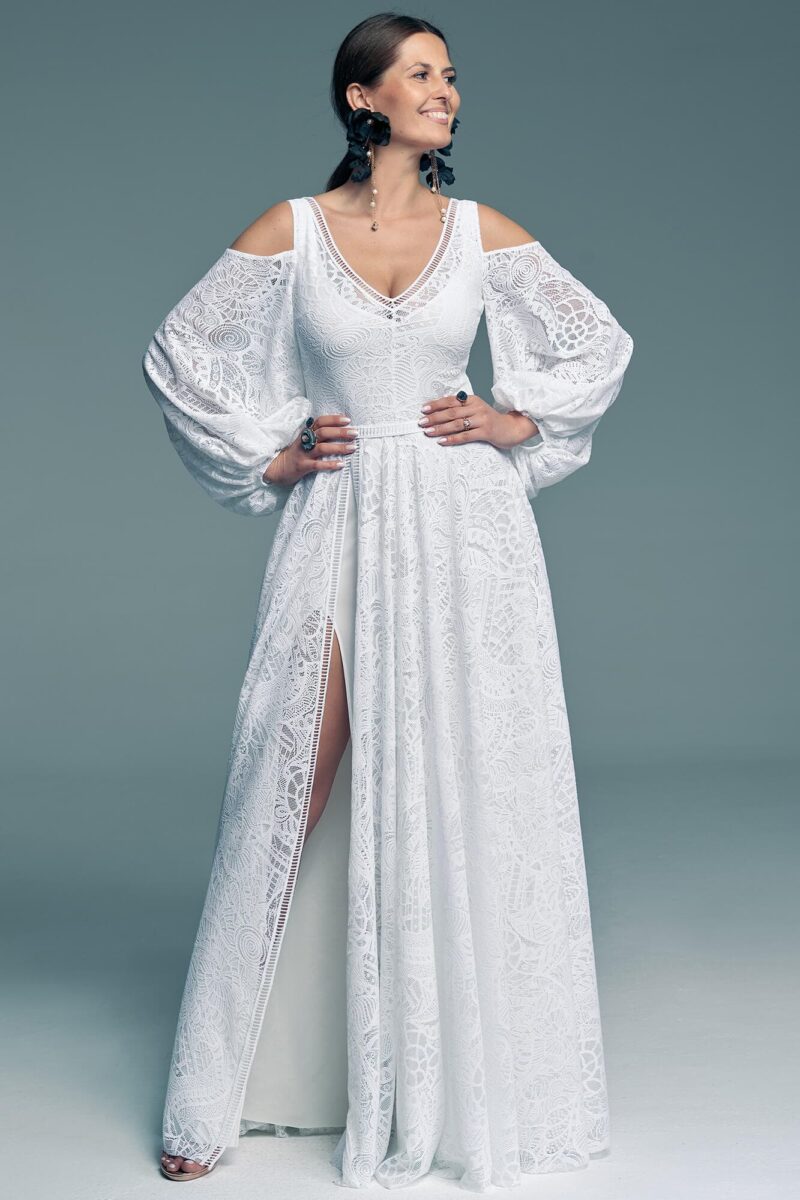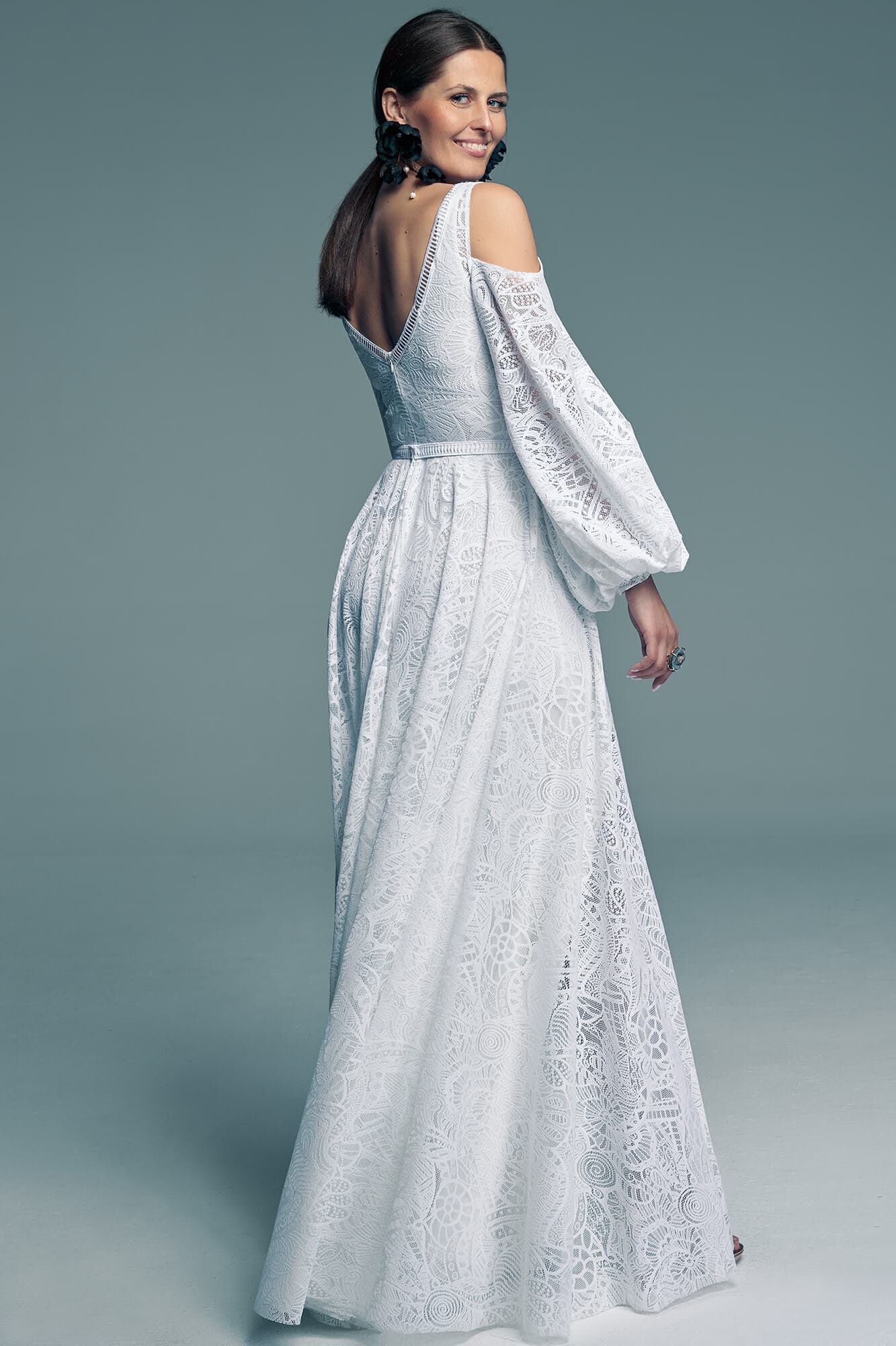 Ta suknia to model wyjściowy - możemy w niej zmienić praktycznie wszystko! Pogłębić lub spłycić dekolt, zmienić jego wykończenie, kształt, dodać lub odjąć falbankę czy frędzle. Rękawy mogą być dłuższe lub krótsze, mieć inny kształt niż te na zdjęciu. Może też nie być ich wcale. Tiul w spódnicy można dodać (lub odjąć) na wierzchu, albo pod spodem. Podszewka może być długa lub krótka w odcieniach bieli i beżu. Rozcięcie na nogę i tren można dodać lub usunąć praktycznie w każdym modelu.