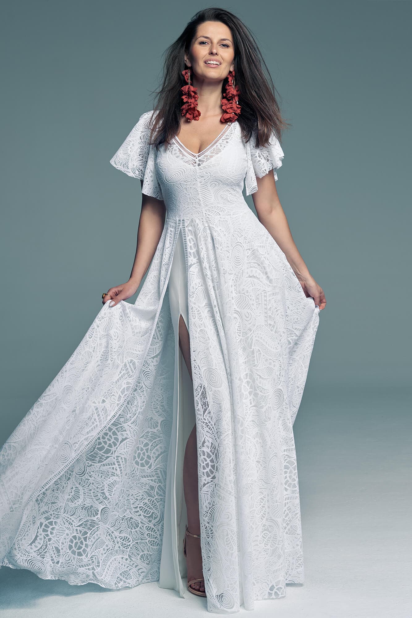 Ta suknia to model wyjściowy - możemy w niej zmienić praktycznie wszystko! Pogłębić lub spłycić dekolt, zmienić jego wykończenie, kształt, dodać lub odjąć falbankę czy frędzle. Rękawy mogą być dłuższe lub krótsze, mieć inny kształt niż te na zdjęciu. Może też nie być ich wcale. Tiul w spódnicy można dodać (lub odjąć) na wierzchu, albo pod spodem. Podszewka może być długa lub krótka w odcieniach bieli i beżu. Rozcięcie na nogę i tren można dodać lub usunąć praktycznie w każdym modelu.
