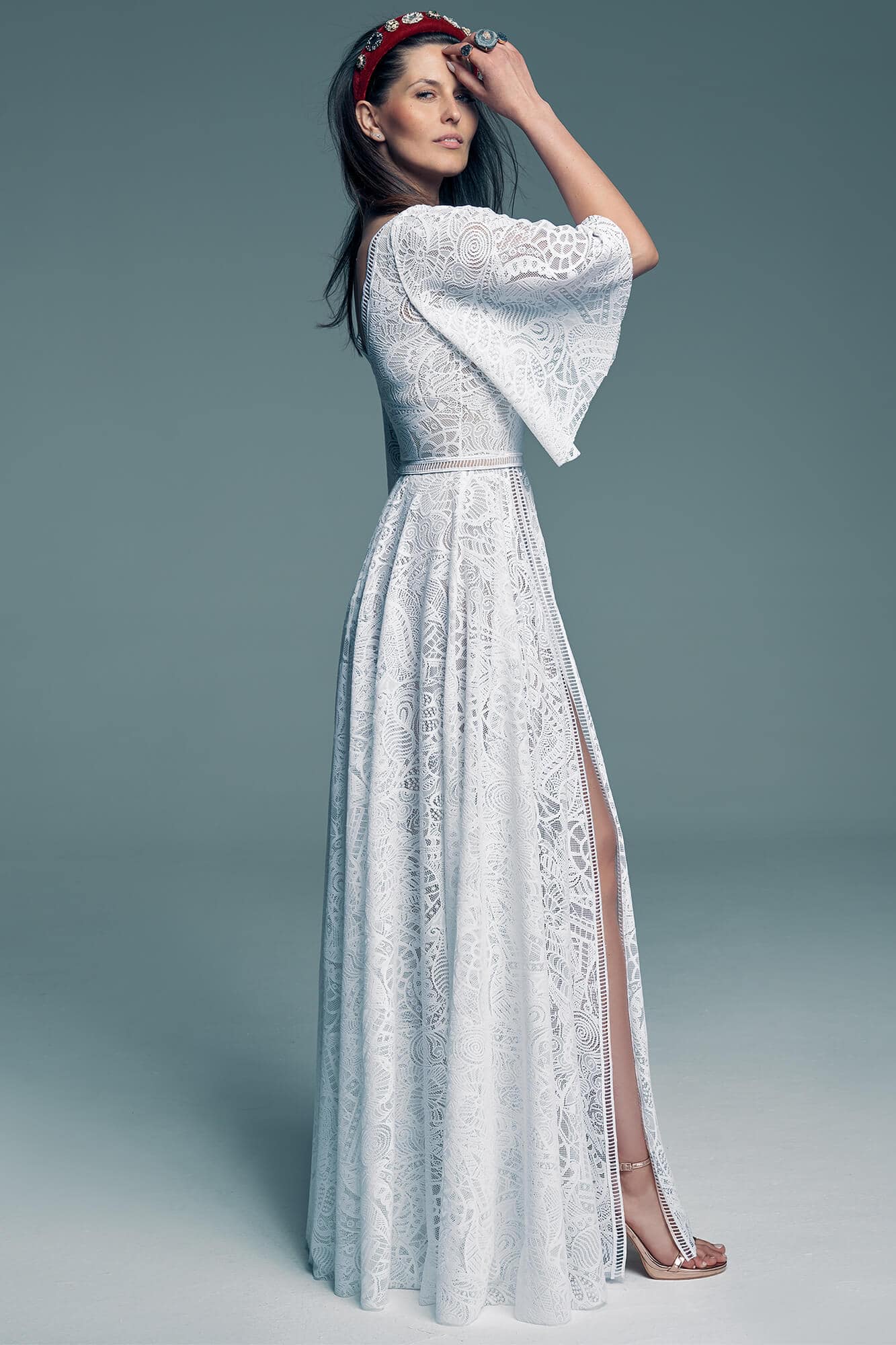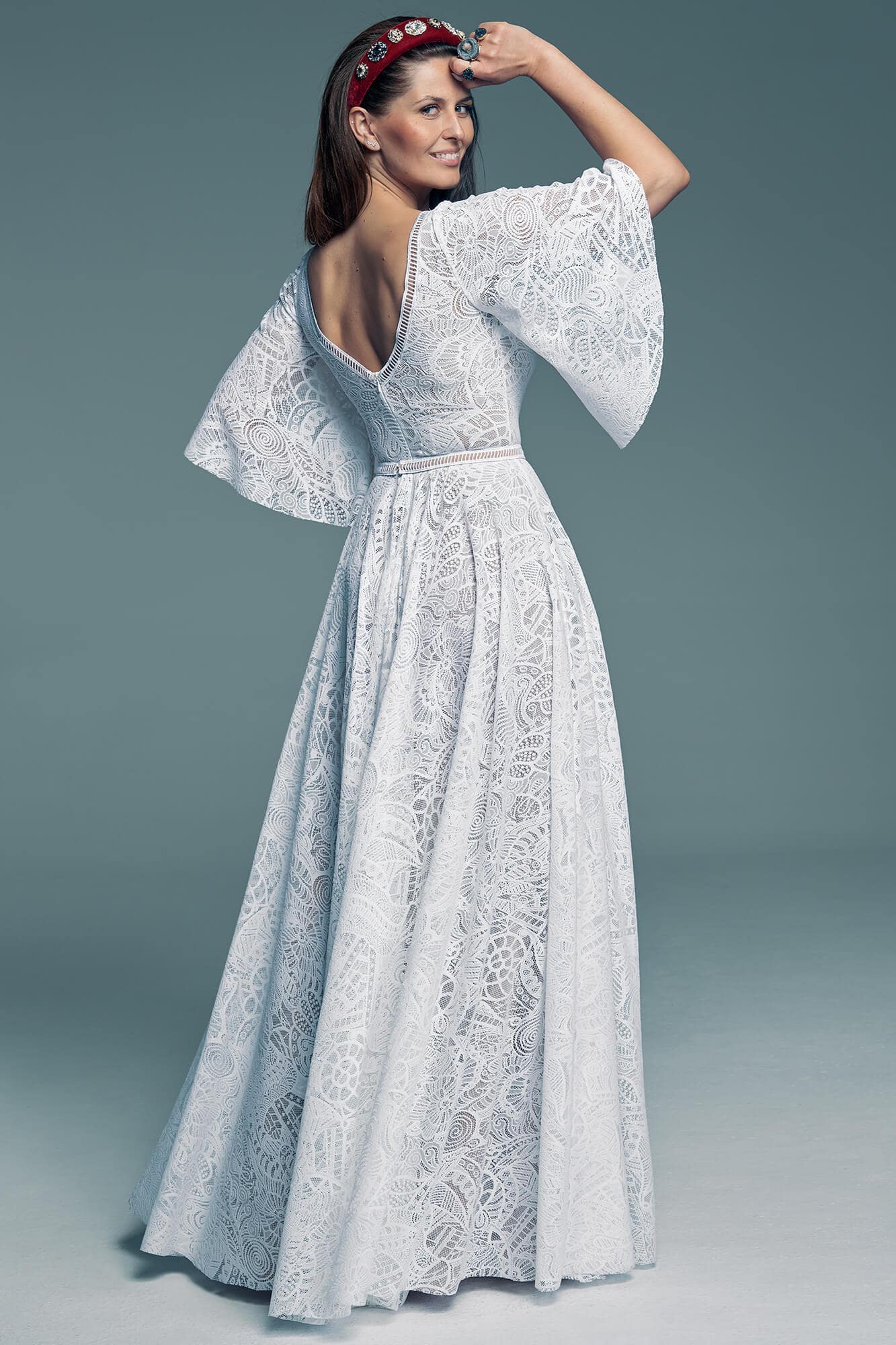 Ta suknia to model wyjściowy - możemy w niej zmienić praktycznie wszystko! Pogłębić lub spłycić dekolt, zmienić jego wykończenie, kształt, dodać lub odjąć falbankę czy frędzle. Rękawy mogą być dłuższe lub krótsze, mieć inny kształt niż te na zdjęciu. Może też nie być ich wcale. Tiul w spódnicy można dodać (lub odjąć) na wierzchu, albo pod spodem. Podszewka może być długa lub krótka w odcieniach bieli i beżu. Rozcięcie na nogę i tren można dodać lub usunąć praktycznie w każdym modelu.