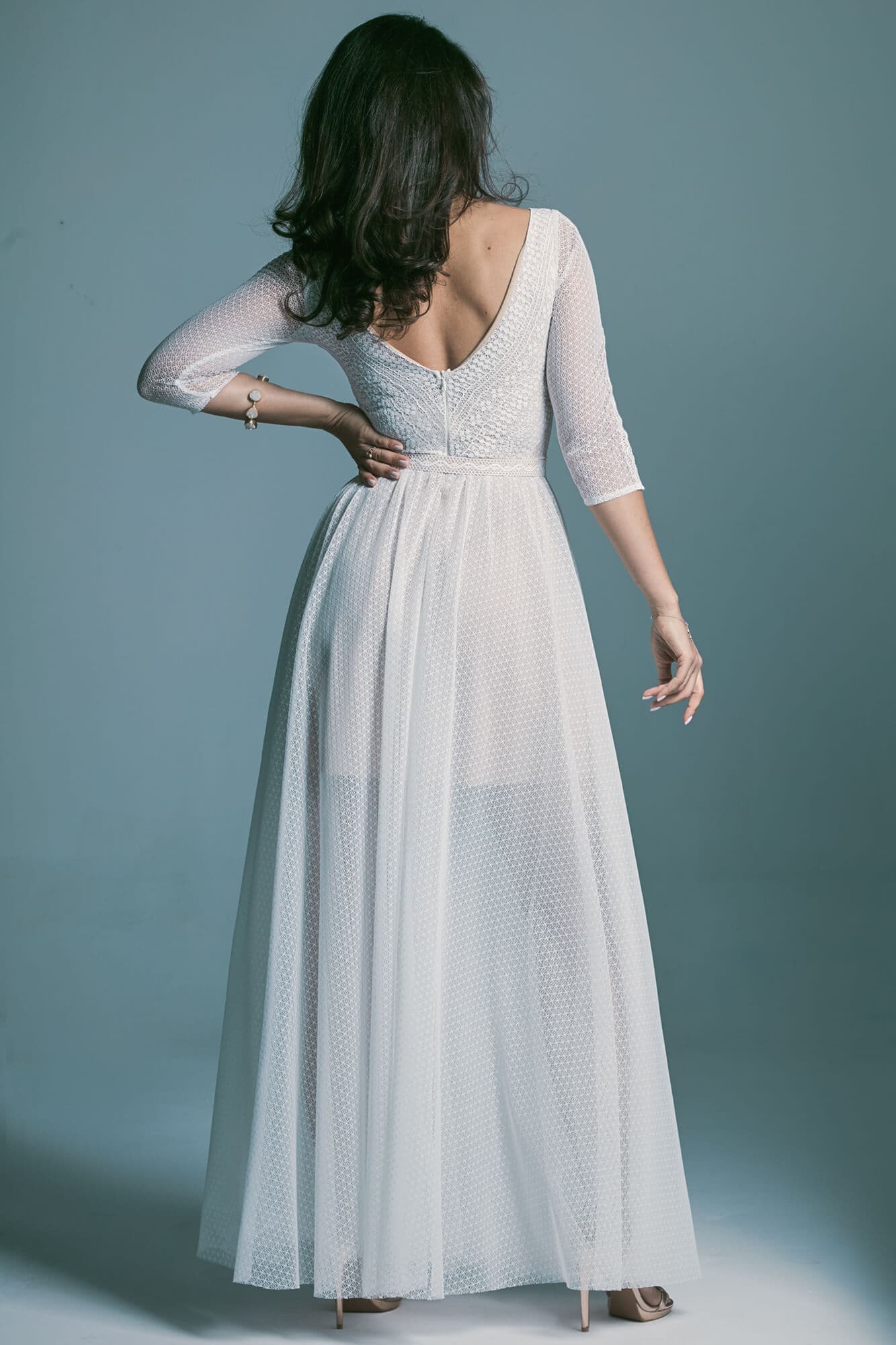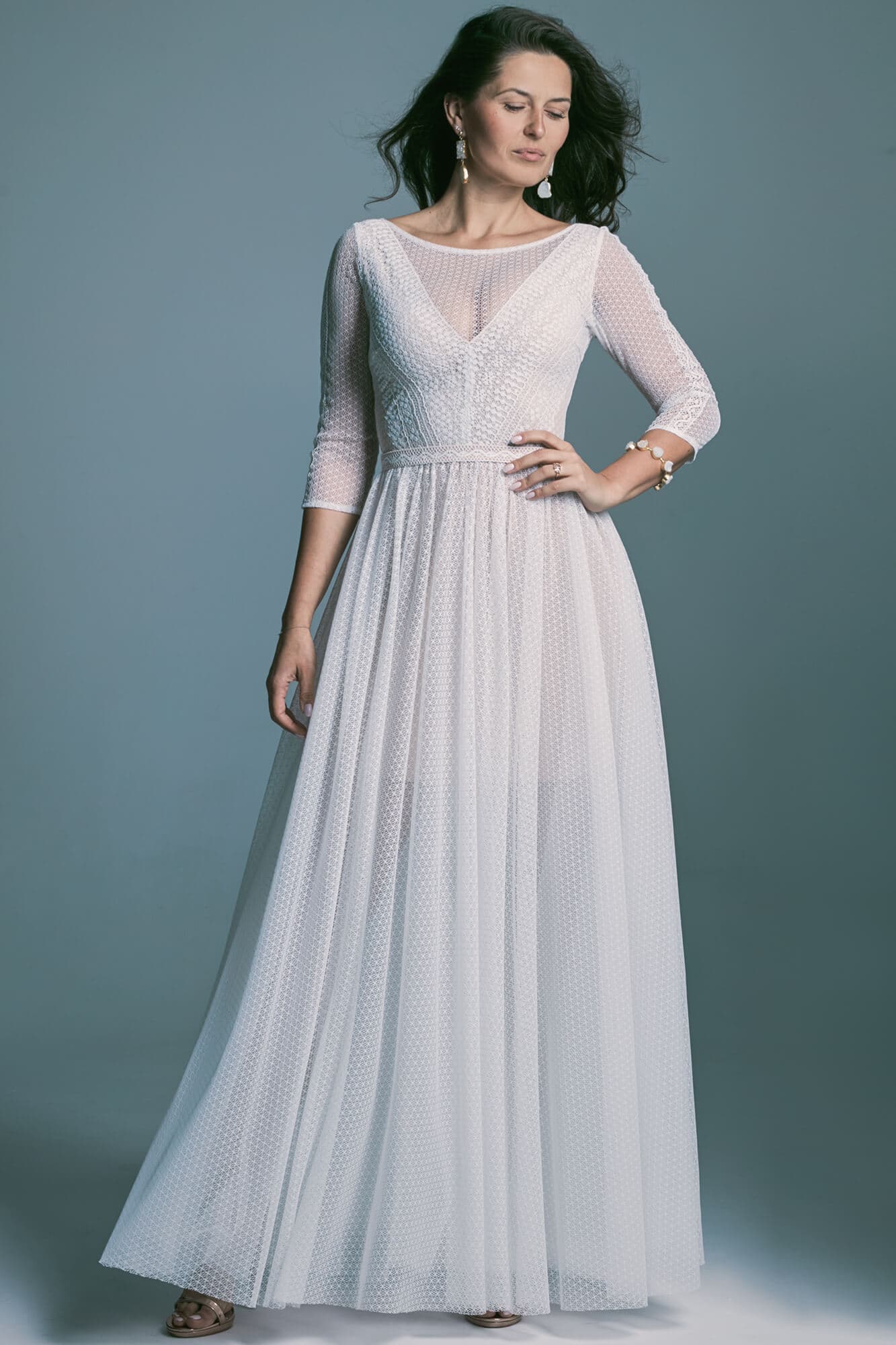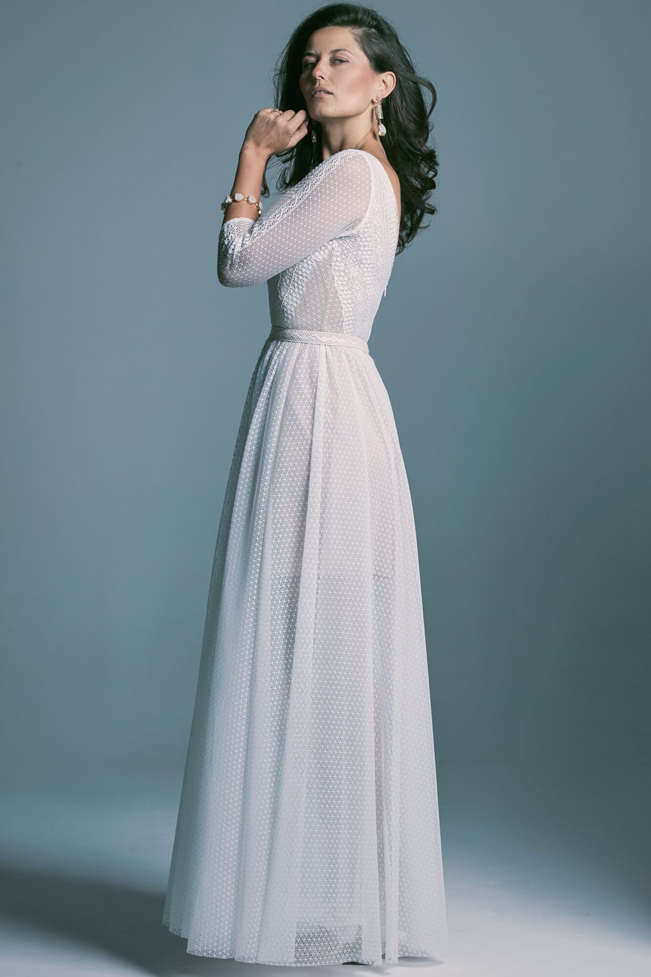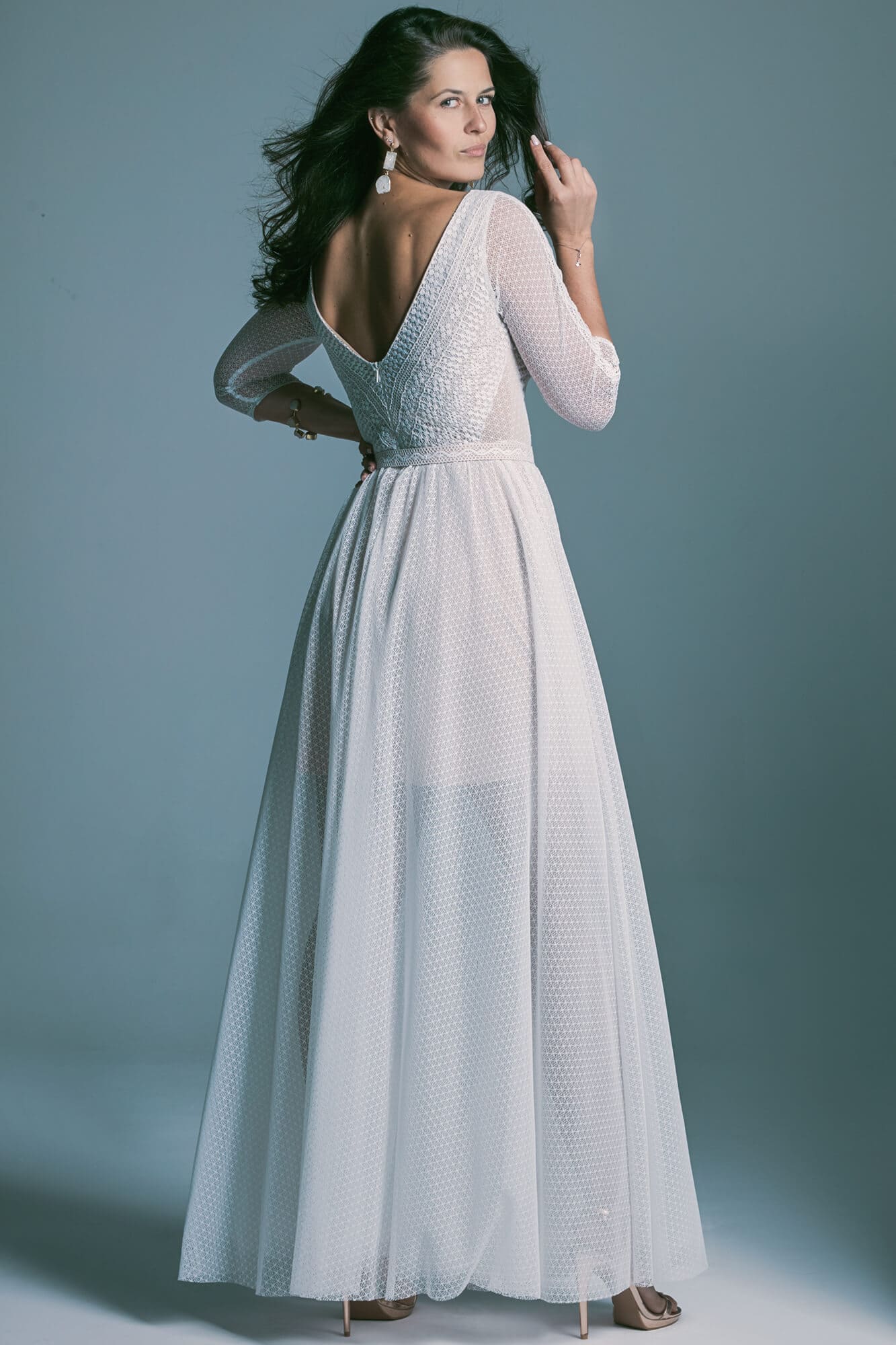 Ta suknia to model wyjściowy - możemy w niej zmienić praktycznie wszystko! Pogłębić lub spłycić dekolt, zmienić jego wykończenie, kształt, dodać lub odjąć falbankę czy frędzle. Rękawy mogą być dłuższe lub krótsze, mieć inny kształt niż te na zdjęciu. Może też nie być ich wcale. Tiul w spódnicy można dodać (lub odjąć) na wierzchu, albo pod spodem. Podszewka może być długa lub krótka w odcieniach bieli i beżu. Rozcięcie na nogę i tren można dodać lub usunąć praktycznie w każdym modelu.