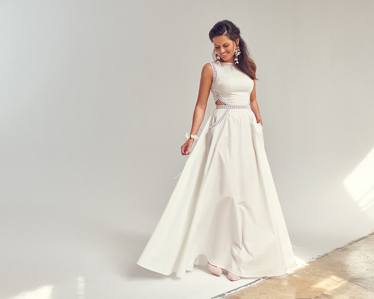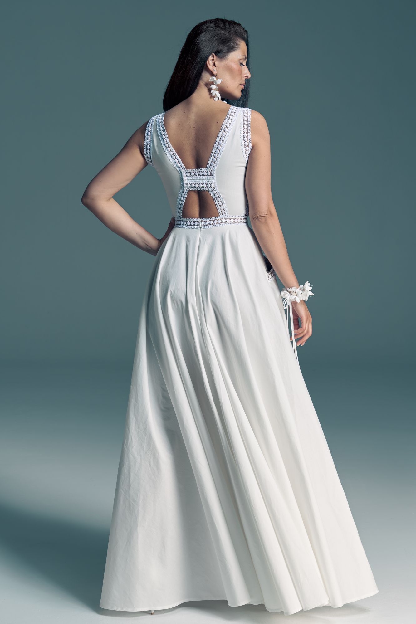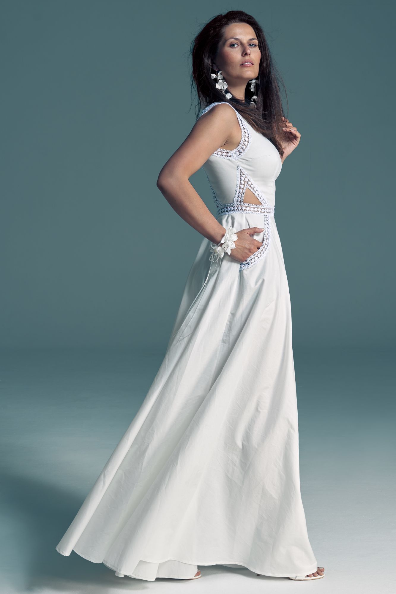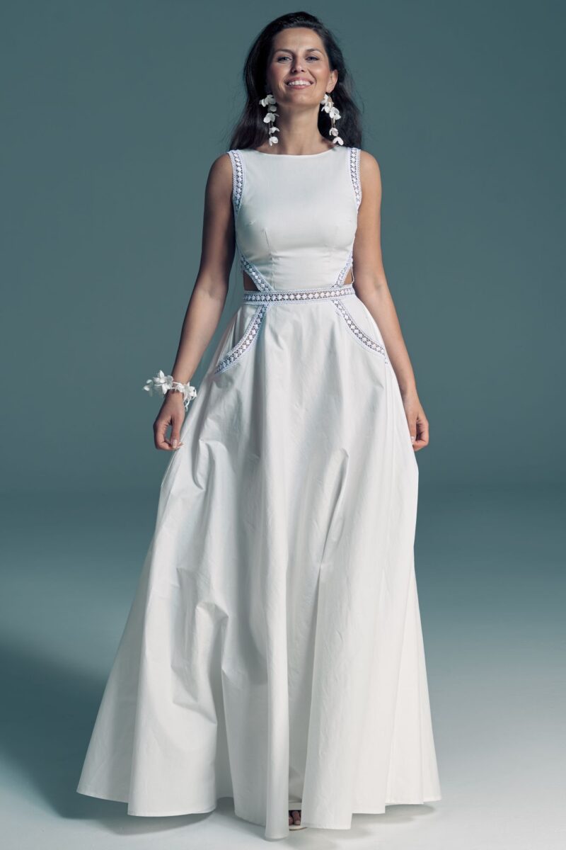 Twoją suknię uszyjemy ze sprawdzonych i przetestowanych przez nas materiałów. W tej sukni dominuje lekka i oddychająca bawełna, jedynie wstawki są z elastycznej koronki. Tkanina ta wprawdzie nie jest tak elastyczna jak nasze koronki i wymaga prasowania, ale jest naturalna i wyjątkowo przyjazna twojej skórze. A jeśli zdecydujesz, by po ślubie przerobić swoją suknię tak, byś mogła ją nosić na co dzień, to z łatwością ją zafarbujesz w profesjonalnej farbiarni.