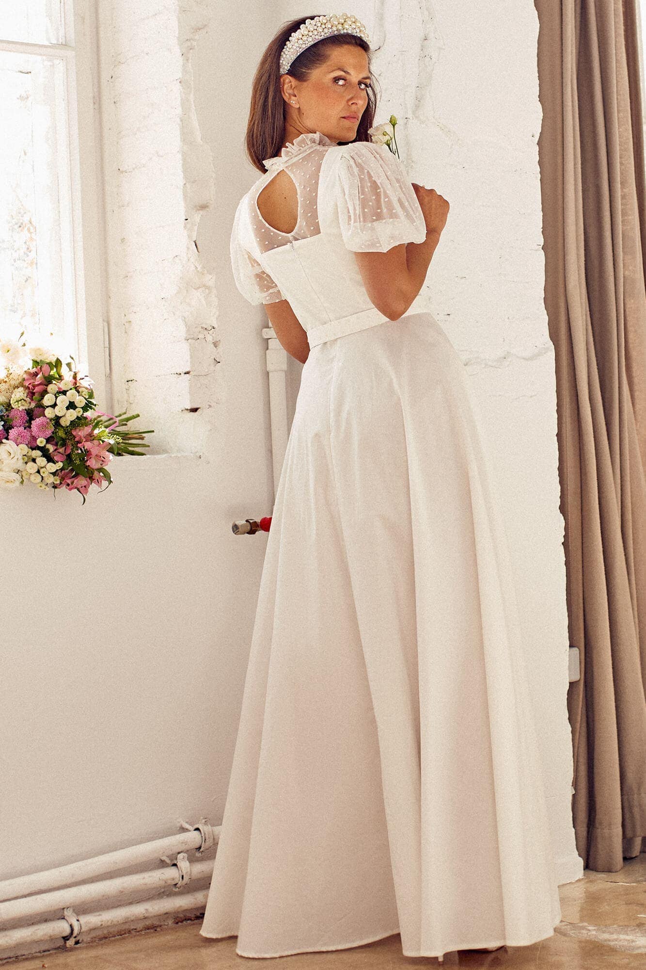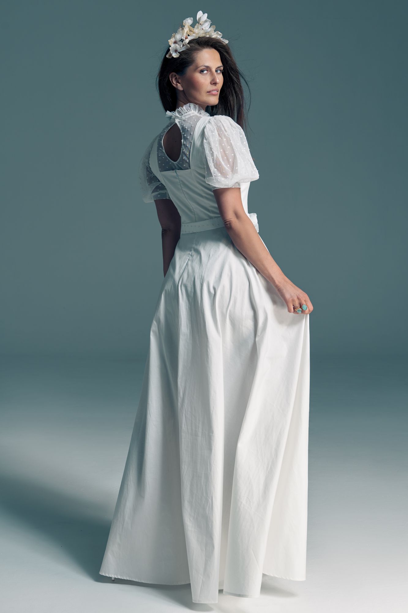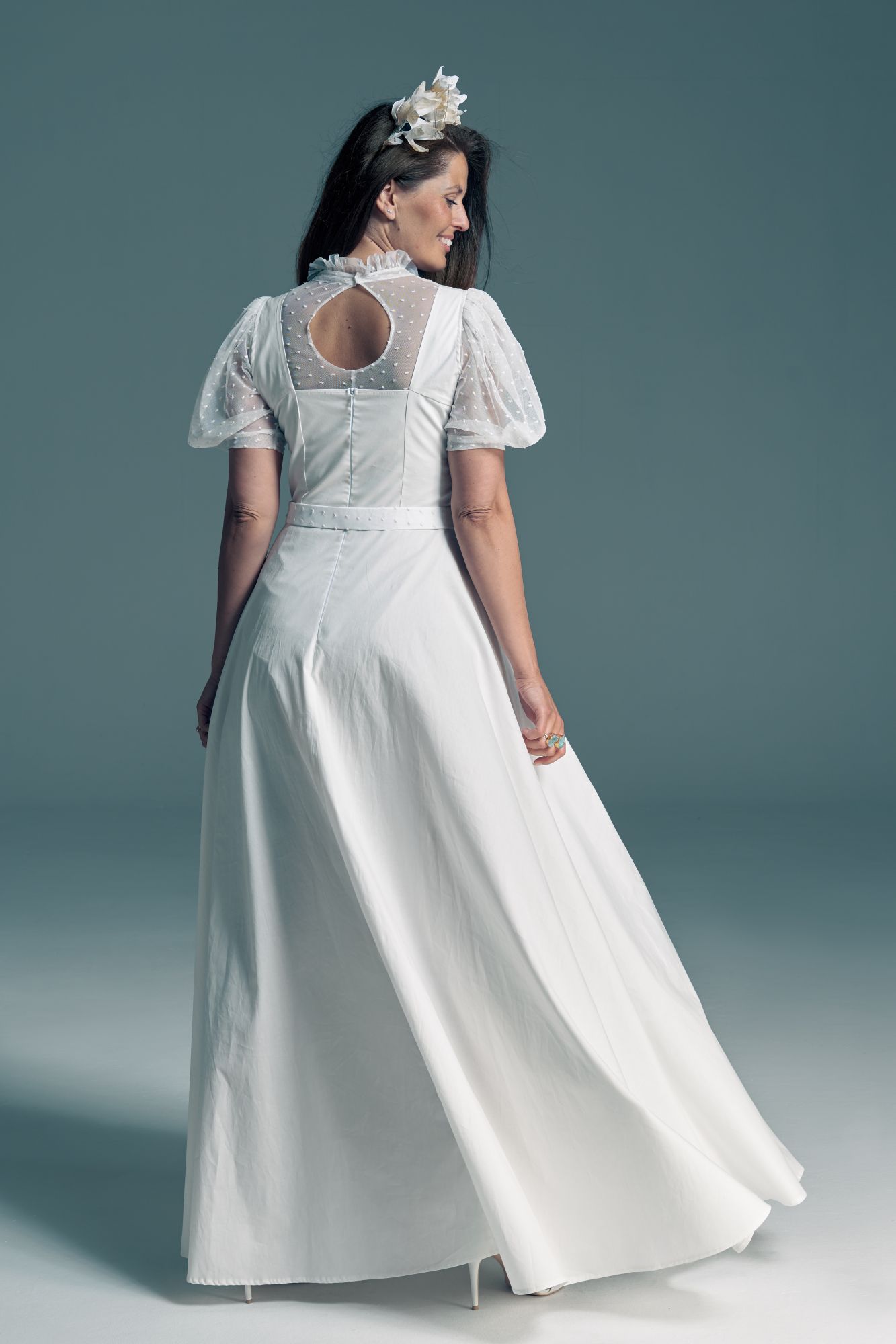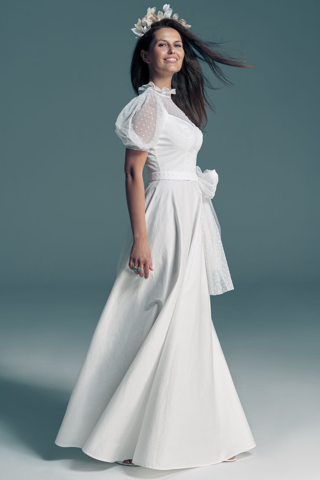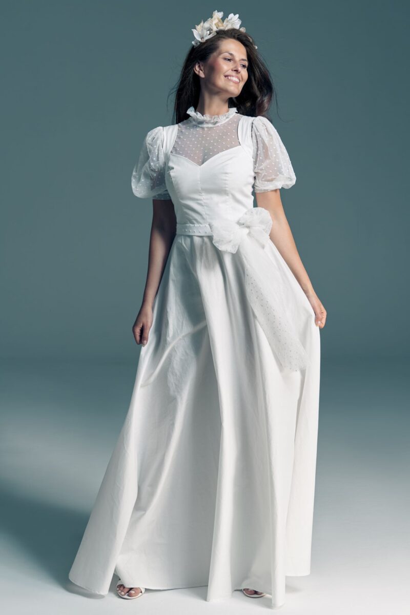 Twoją suknię uszyjemy ze sprawdzonych i przetestowanych przez nas materiałów. W tej sukni dominuje lekka i oddychająca bawełna, jedynie wstawki są z elastycznej koronki. Tkanina ta wprawdzie nie jest tak elastyczna jak nasze koronki i wymaga prasowania, ale jest naturalna i wyjątkowo przyjazna twojej skórze. A jeśli zdecydujesz, by po ślubie przerobić swoją suknię tak, byś mogła ją nosić na co dzień, to z łatwością ją zafarbujesz w profesjonalnej farbiarni.