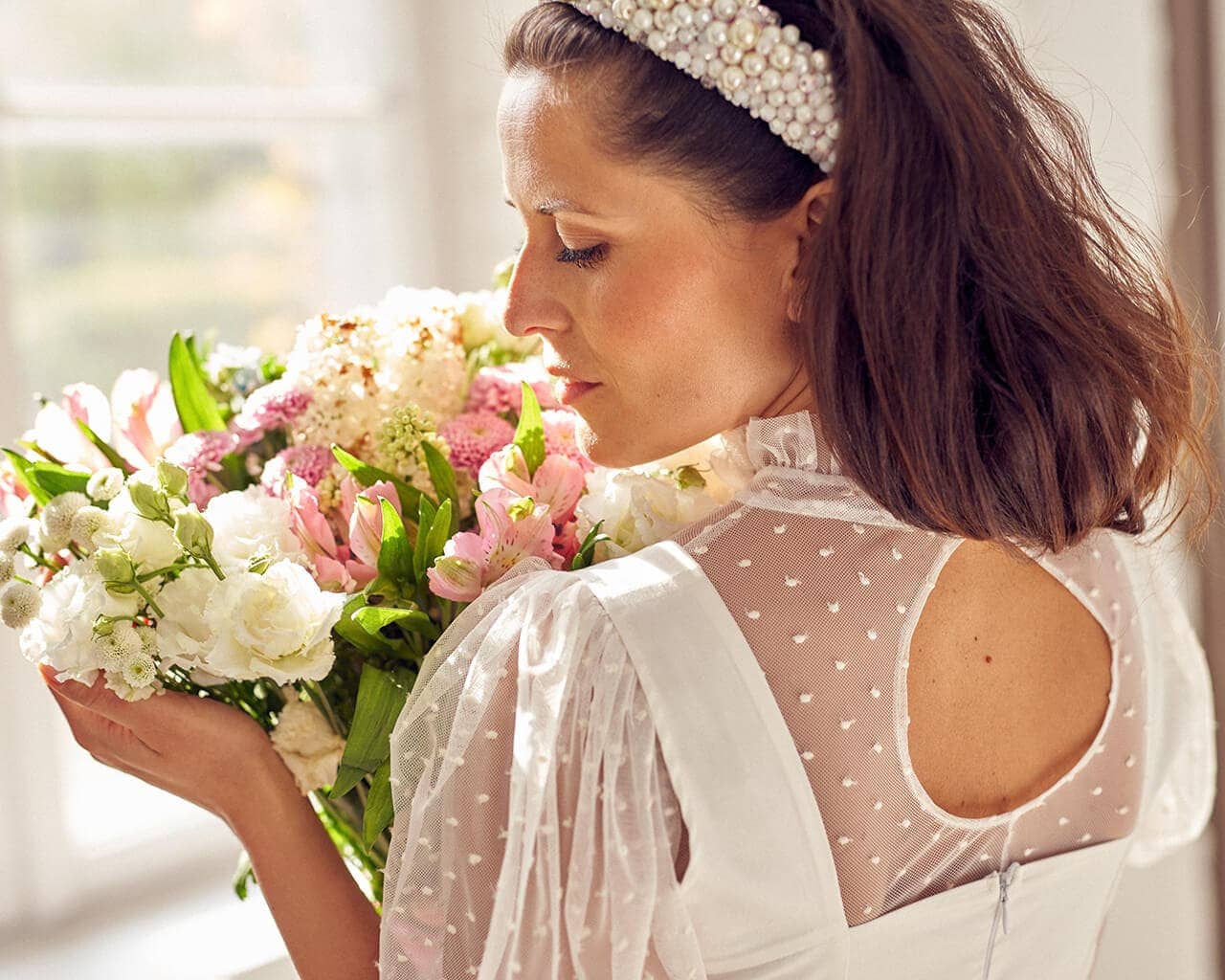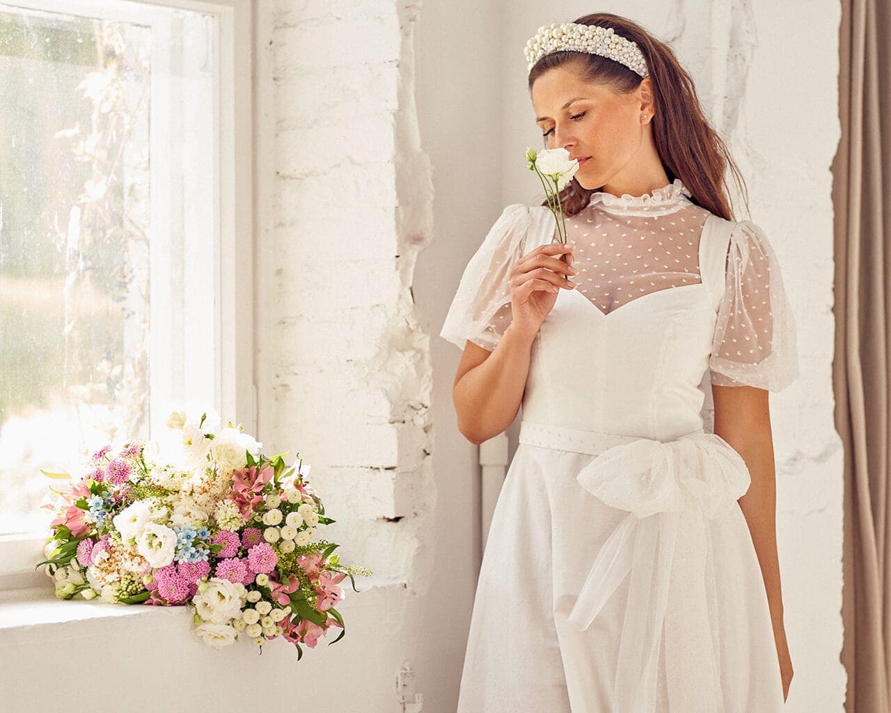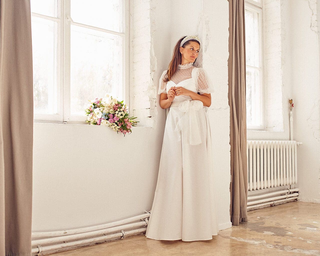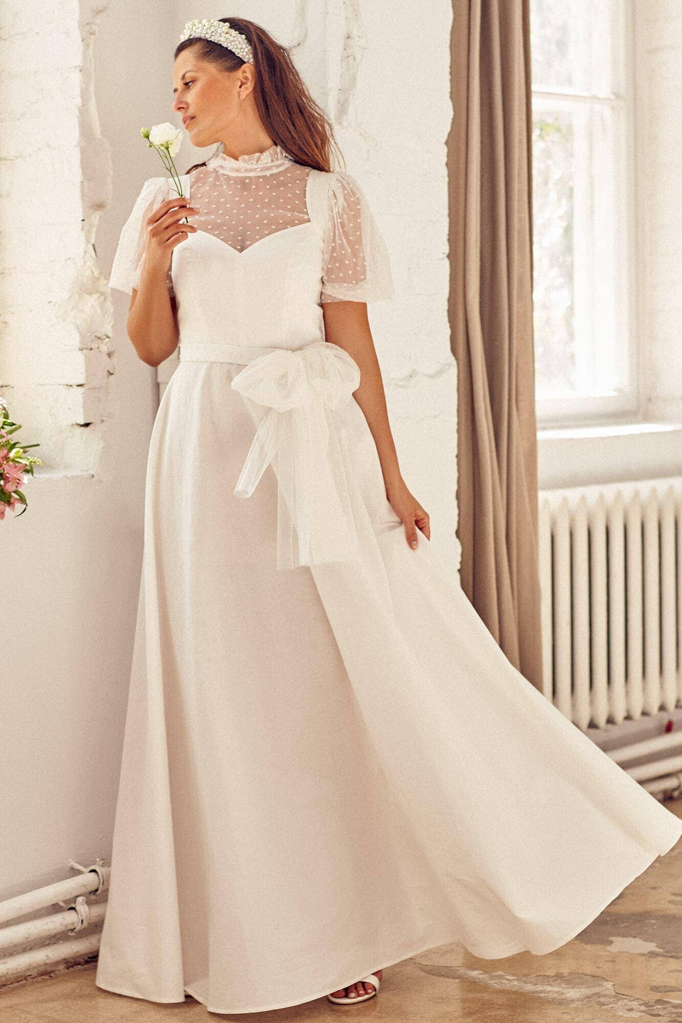 Twoją suknię uszyjemy ze sprawdzonych i przetestowanych przez nas materiałów. W tej sukni dominuje lekka i oddychająca bawełna, jedynie wstawki są z elastycznej koronki. Tkanina ta wprawdzie nie jest tak elastyczna jak nasze koronki i wymaga prasowania, ale jest naturalna i wyjątkowo przyjazna twojej skórze. A jeśli zdecydujesz, by po ślubie przerobić swoją suknię tak, byś mogła ją nosić na co dzień, to z łatwością ją zafarbujesz w profesjonalnej farbiarni.