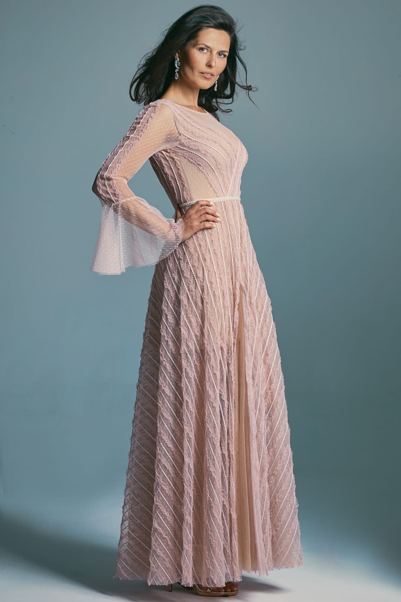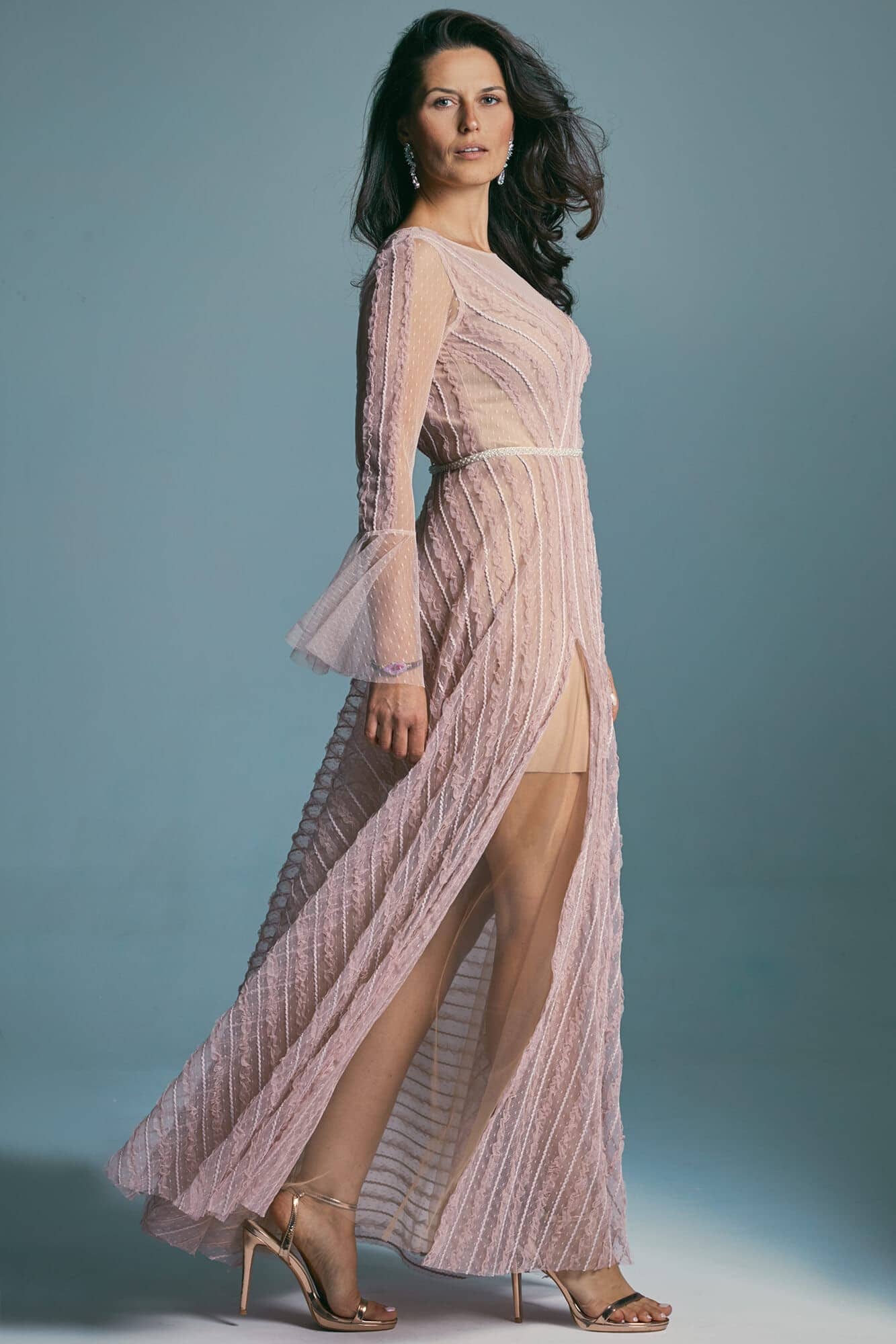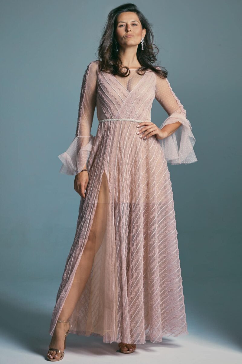 Ta suknia to model wyjściowy - możemy w niej zmienić praktycznie wszystko! Pogłębić lub spłycić dekolt, zmienić jego wykończenie, kształt, dodać lub odjąć falbankę czy frędzle. Rękawy mogą być dłuższe lub krótsze, mieć inny kształt niż te na zdjęciu. Może też nie być ich wcale. Tiul w spódnicy można dodać (lub odjąć) na wierzchu, albo pod spodem. Podszewka może być długa lub krótka w odcieniach bieli i beżu. Rozcięcie na nogę i tren można dodać lub usunąć praktycznie w każdym modelu.