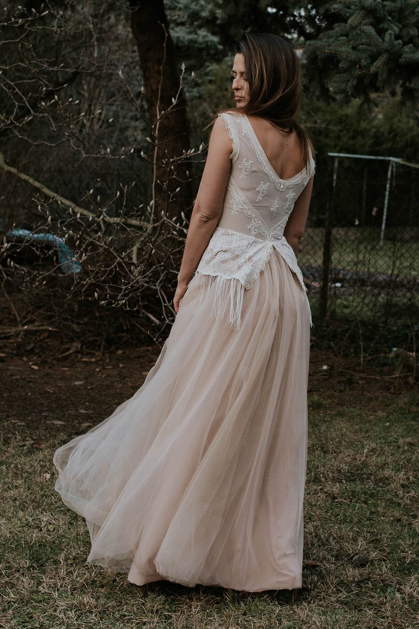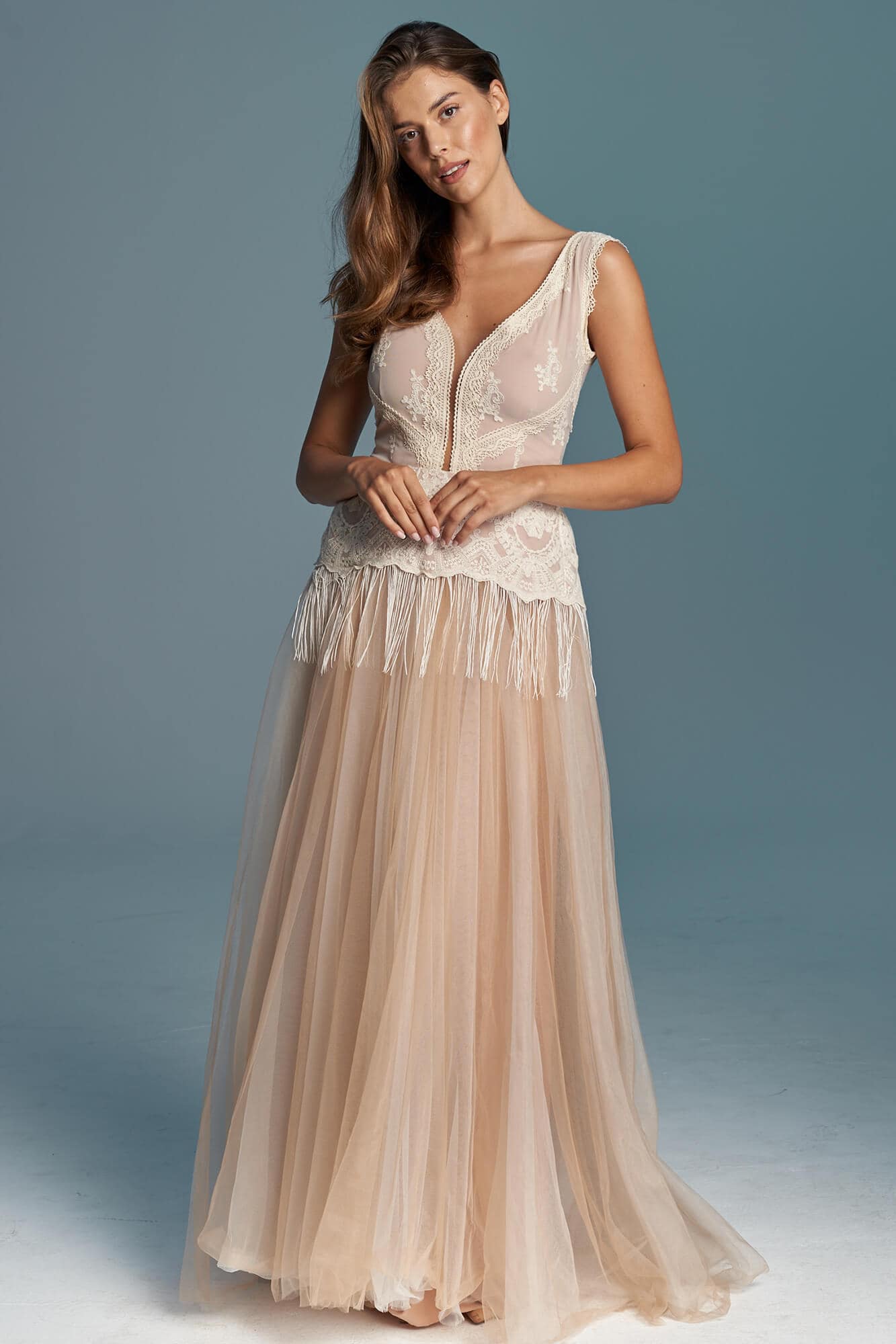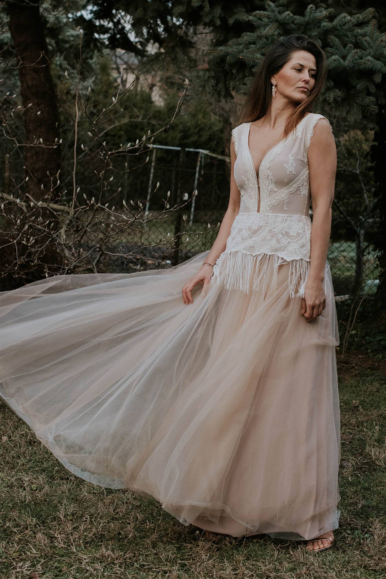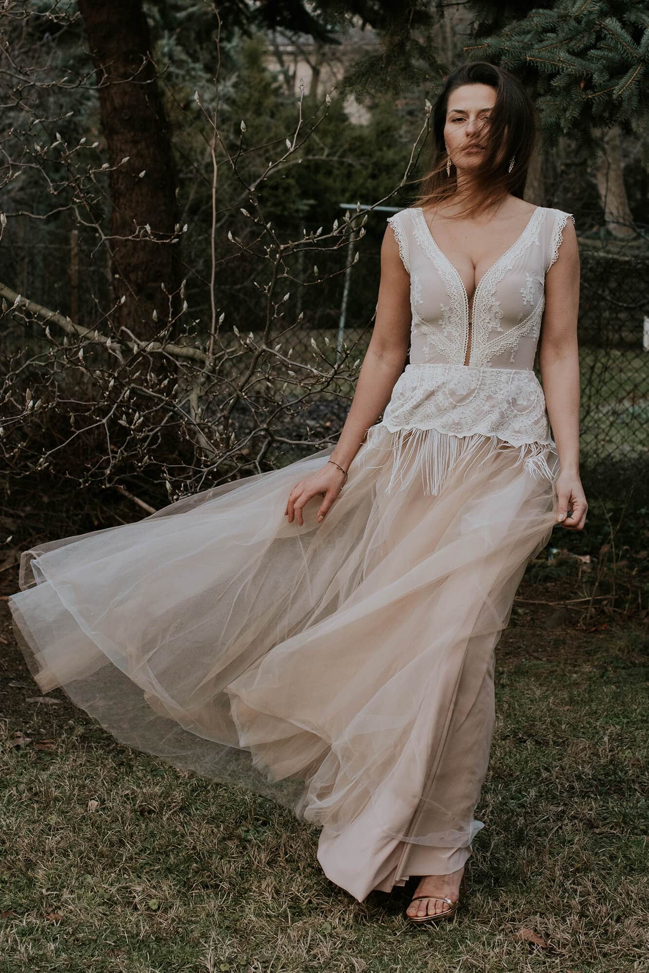 Suknia ślubna typu księżniczka, ale z nutką boho to coś dla dziewczyn, które od dziecka marzyły by w dniu ślubu wyglądać jak Kopciuszek, ale kochają też frędzle Pocahontas. W tym modelu dominują cielisty tiul na spódnicy, głęboki dekolt oraz baskinka z frędzlami. Pamiętaj jednak, że szyjąc ten model dla Ciebie na miarę możemy zmienić spódnicę z tiulowej na koronkową (lub zmienić kolor tiulu na biały), usunąć baskinkę, spłycić dekolt, dodać dowolne rękawy czy zmienić kolor podszewki!