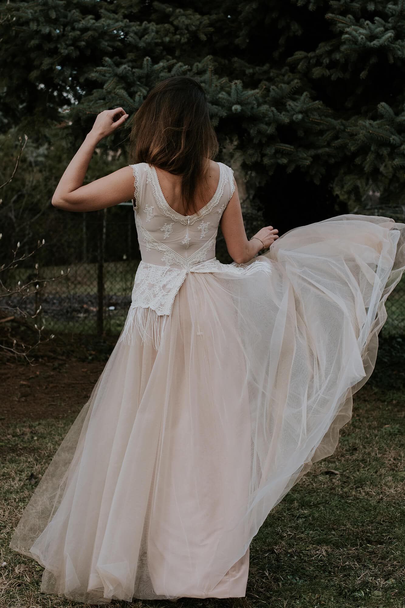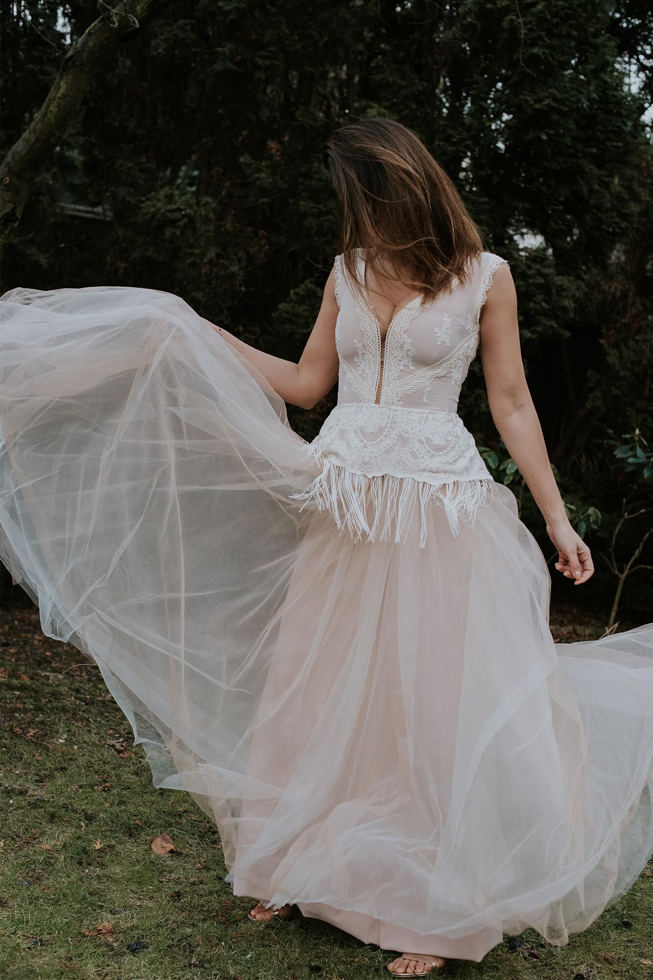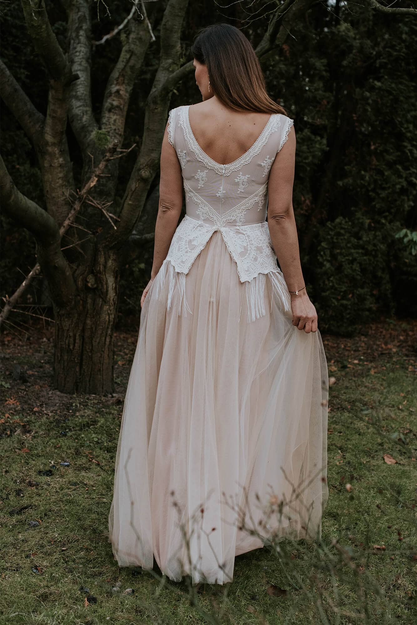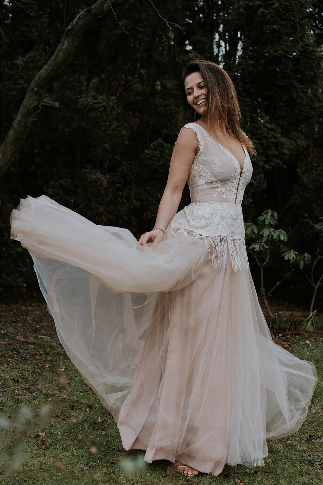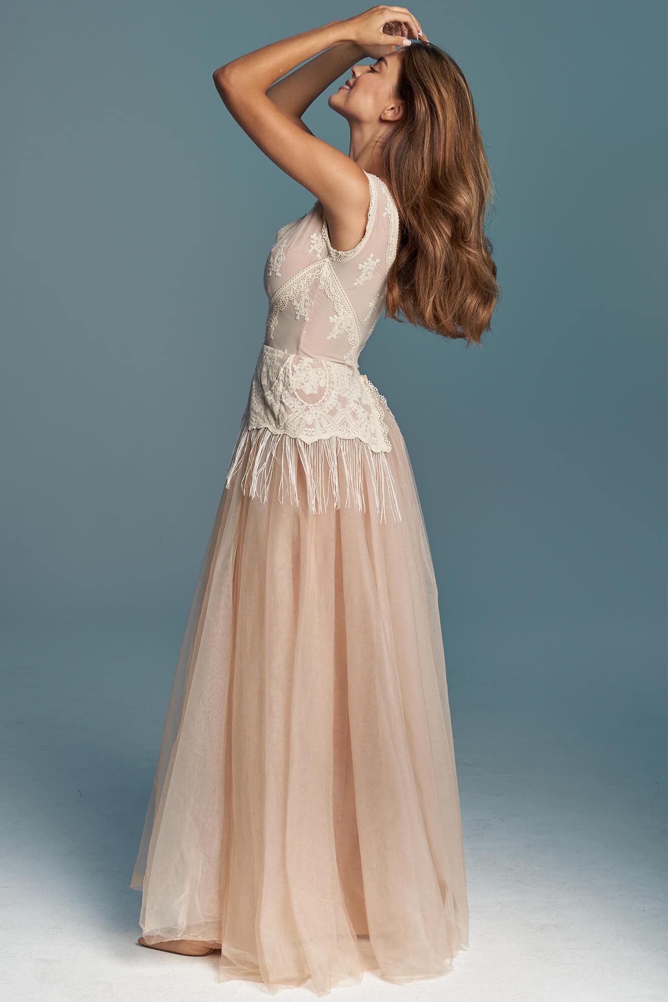 Suknia ślubna typu księżniczka, ale z nutką boho to coś dla dziewczyn, które od dziecka marzyły by w dniu ślubu wyglądać jak Kopciuszek, ale kochają też frędzle Pocahontas. W tym modelu dominują cielisty tiul na spódnicy, głęboki dekolt oraz baskinka z frędzlami. Pamiętaj jednak, że szyjąc ten model dla Ciebie na miarę możemy zmienić spódnicę z tiulowej na koronkową (lub zmienić kolor tiulu na biały), usunąć baskinkę, spłycić dekolt, dodać dowolne rękawy czy zmienić kolor podszewki!