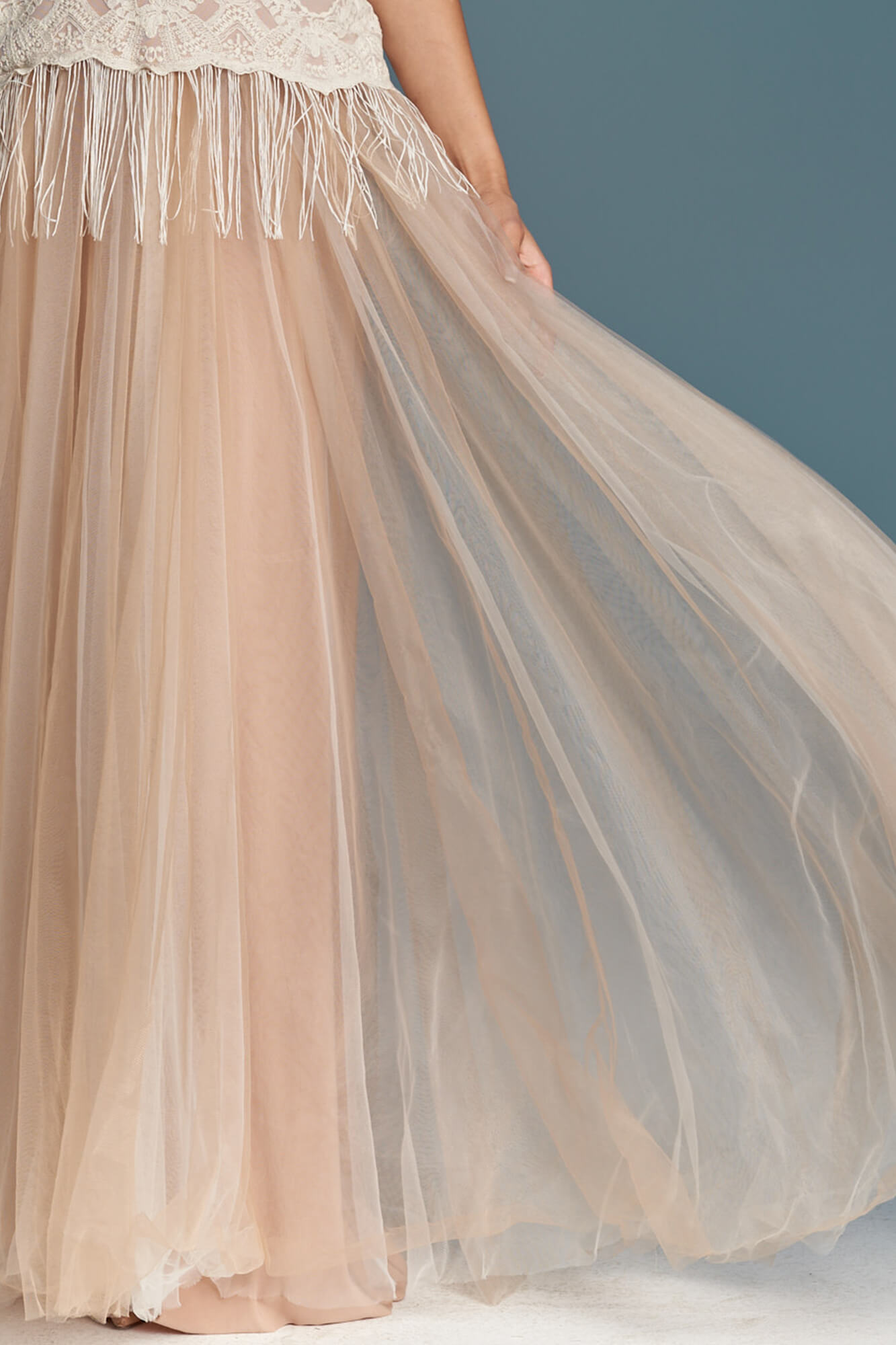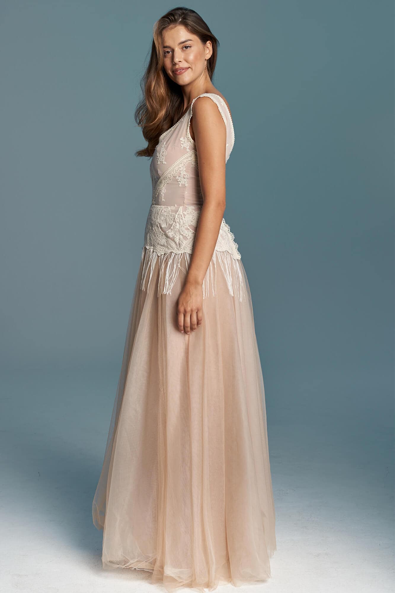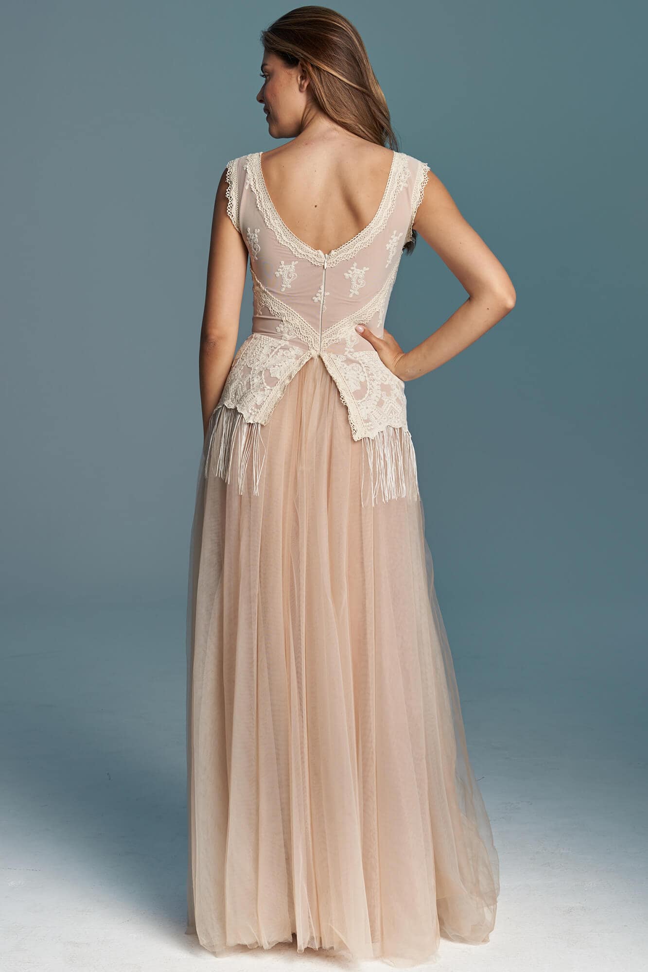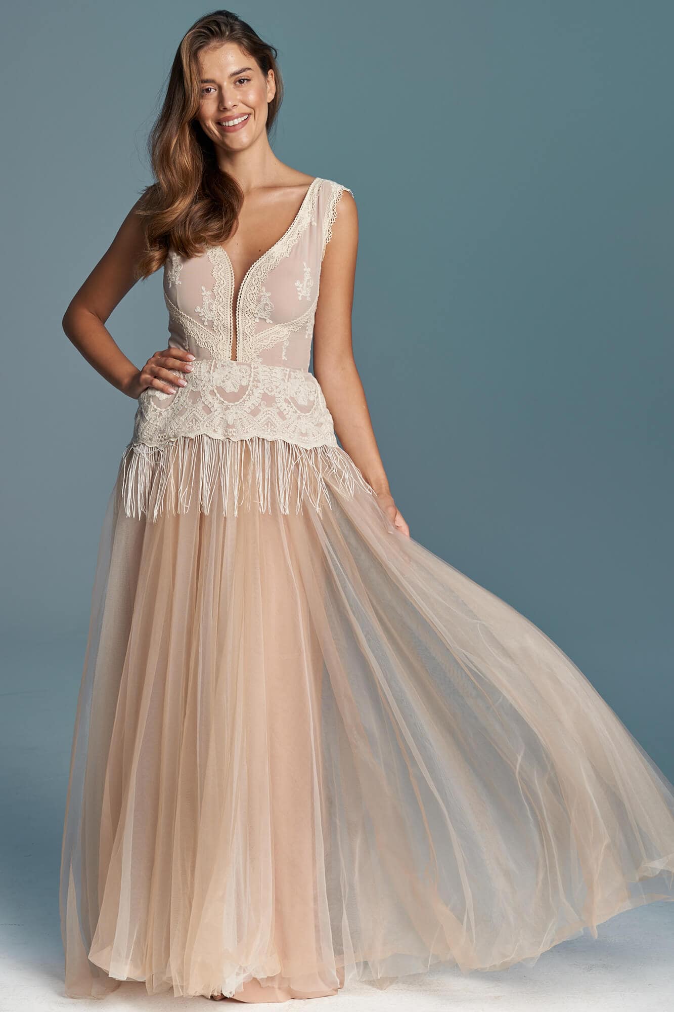 Suknia ślubna typu księżniczka, ale z nutką boho to coś dla dziewczyn, które od dziecka marzyły by w dniu ślubu wyglądać jak Kopciuszek, ale kochają też frędzle Pocahontas. W tym modelu dominują cielisty tiul na spódnicy, głęboki dekolt oraz baskinka z frędzlami. Pamiętaj jednak, że szyjąc ten model dla Ciebie na miarę możemy zmienić spódnicę z tiulowej na koronkową (lub zmienić kolor tiulu na biały), usunąć baskinkę, spłycić dekolt, dodać dowolne rękawy czy zmienić kolor podszewki!