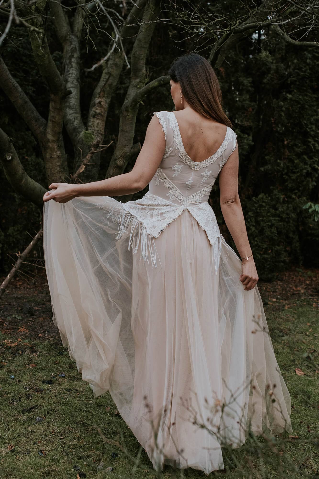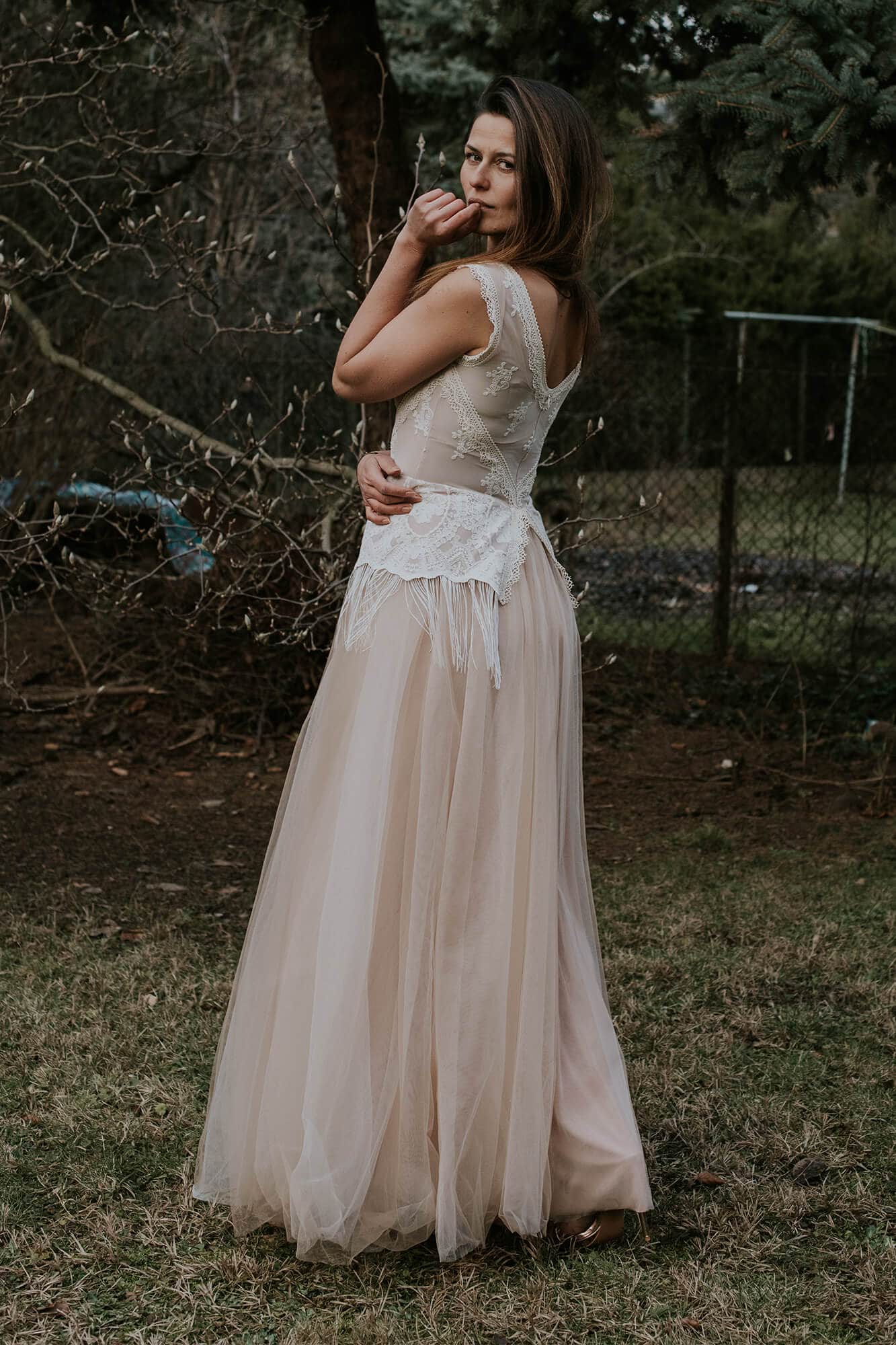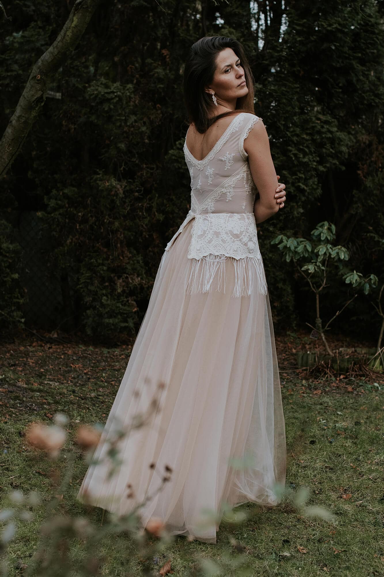 Ta oryginalna suknia ślubna z beżowych, bawełnianych koronek to propozycja idealnie pasująca do stylu vintage, rustykalnego i boho. Jeśli jesteś niepokorną duszą, która uwielbia, gdy tradycyjne stroje wymykają się schematom, koniecznie zobacz ten model. Wiele osób kocha boho za jego zmienne oblicze i za to, że wymyka się wszelkim kanonom i standardom. Takie modowe łamanie reguł daje niezwykłe efekty. Tak też było w przypadku tej kreacji. Koronka zdobiąca górę sukni jest ułożona na cielistym podkładzie, dzięki czemu zyskuje oryginalny, ciepły odcień. Podszewka w neutralnym kolorze dopasowanym do kolorystki ciała sprawiła, że niezwykła faktura materiału jest doskonale widoczna. Suknia ślubna z beżowych, bawełnianych koronek została zaprojektowana tak, aby jak najlepiej eksponować biust oraz modelować sylwetkę. Głęboki dekolt, stopniowo zwężający się ku dołowi, który przechodzi w cienką linię sięgającą pasa, optycznie wydłuża kształt postaci oraz zmysłowo podkreśla biust. Ozdobna taśma, która została wykorzystana do wykończenia krawędzi dekoltu, a także obszycia ramion, oraz linii pod biustem nadaje sukni ślubnej niemal królewskiej dostojności i szyku. Zwróć uwagę na precyzyjne zdobienia pokrywające taśmę! Jej zastosowanie ma jeszcze jeden ukryty walor – ukośne linie poprowadzone są w taki sposób, aby maksymalnie podkreślić talię. Suknia ślubna z beżowych, bawełnianych koronek to ponadczasowe rozwiązanie nawiązujące do estetyki minionych epok, a baskinka z frędzlami na biodrach stanowi przełamanie stylu i jest ukłonem w stronę nieznającego konwenansów boho. Spódnica sukni jest uszyta z warstw białego i cielistego tiulu, które doskonale się uzupełniają tworząc przepiękny odcień przypominający kremową kawę z mlekiem. Ten model jest idealny dla kobiet, które mają przepiękne krągłości i w dniu ślubu pragną je podkreślić. Rozważ wybór tej kreacji, jeśli masz wąskie biodra. Baskinka i frędzle przepięknie je „zbudują”.