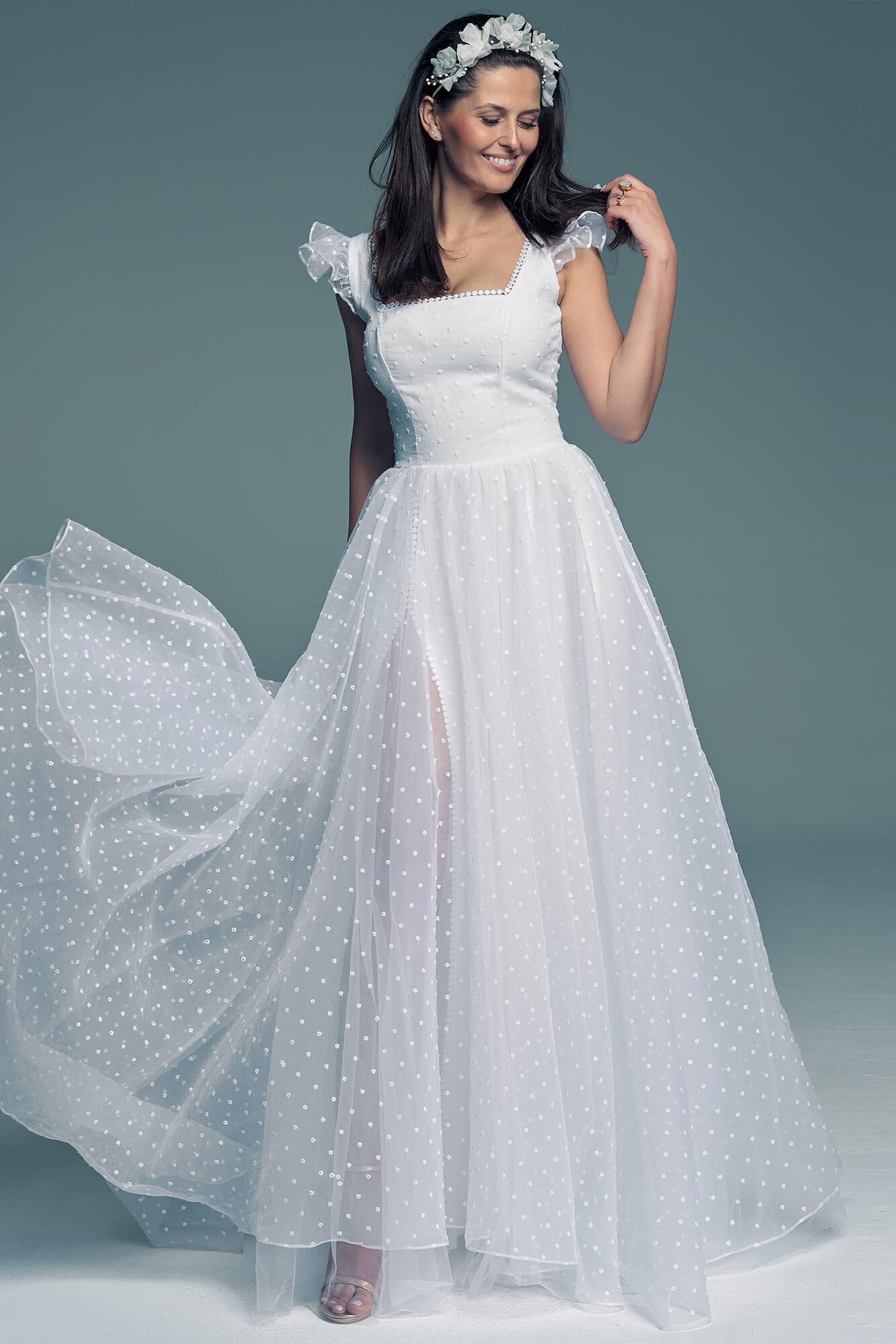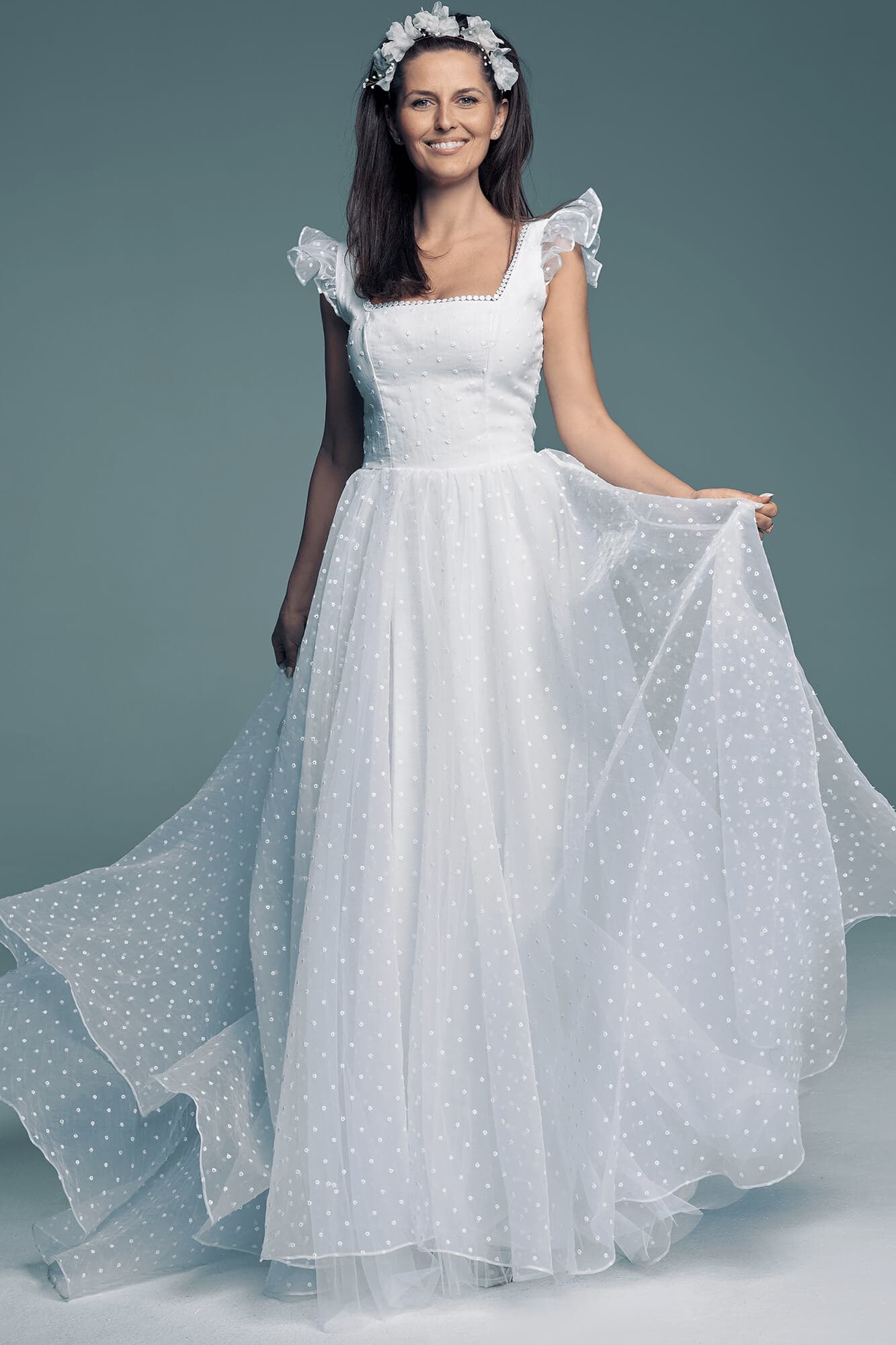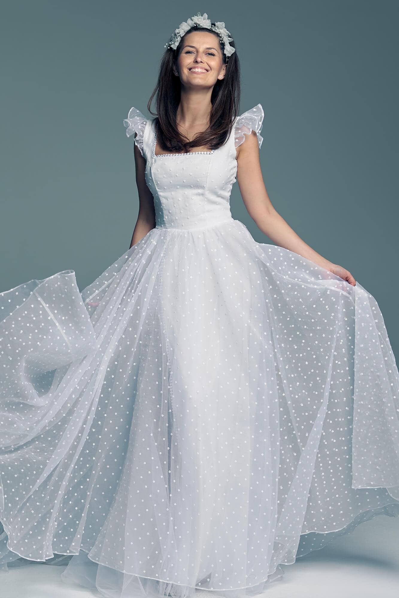 Suknia ślubna niczym z krainy lodu to propozycja uszyta z białej organtyny w groszki, z dekoltem karo, obszerną spódnicą i sterczącymi rękawkami. Pamiętaj jednak, że szyjąc ten model dla Ciebie na miarę każdy z tych elementów możemy zmienić! Dekolt karo możemy zastąpić V lub łódeczką, rękaw może być krótki, długi z bufką lub można go zastąpić frędzlami. Spódnica może być jeszcze większa lub znacznie mniejsza. Kolor podszewki nie musi być biały – mamy także piaskową i cielistą.